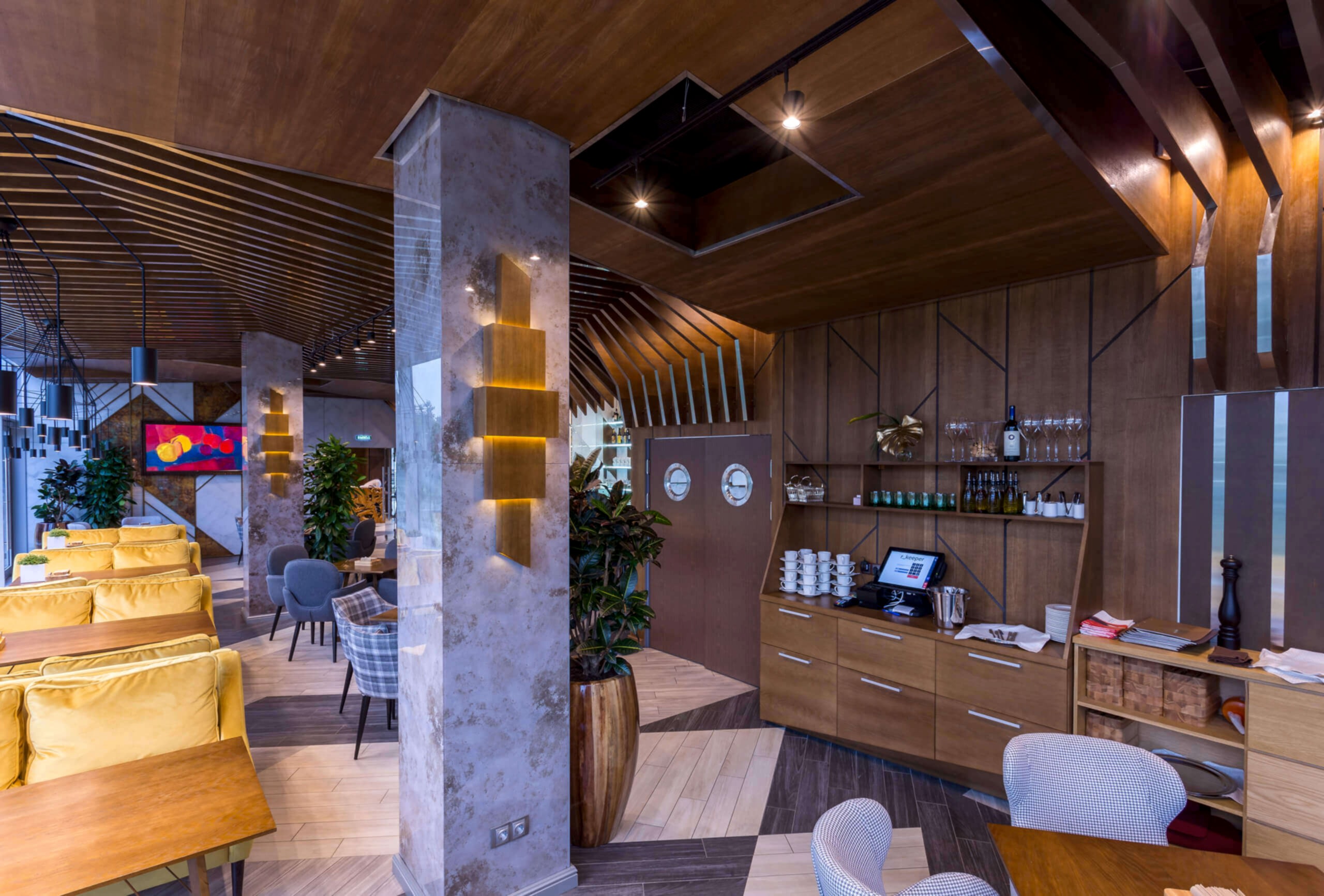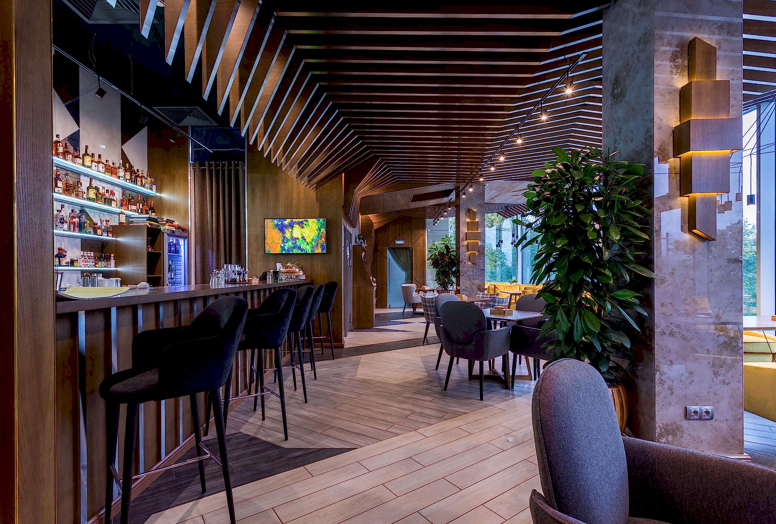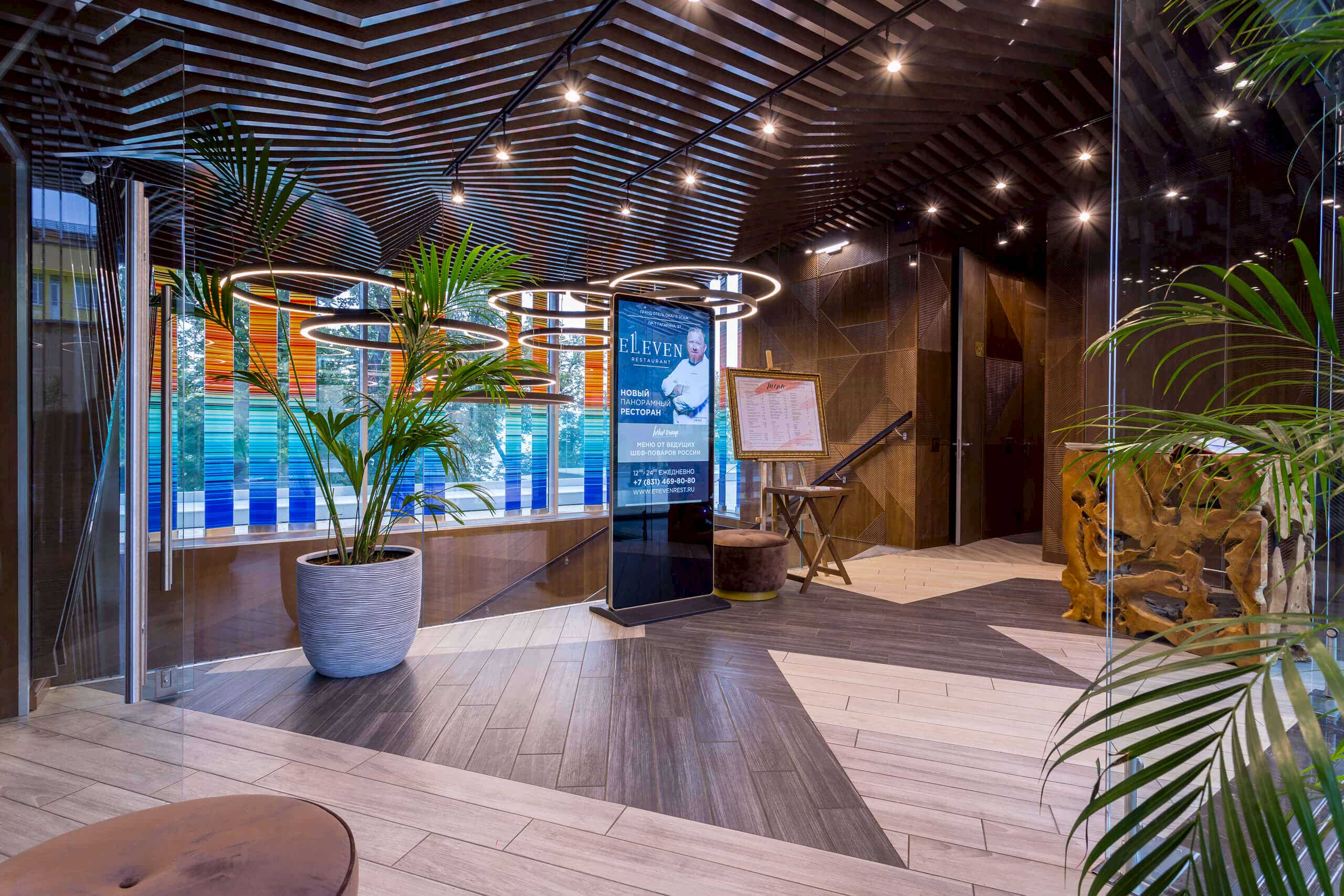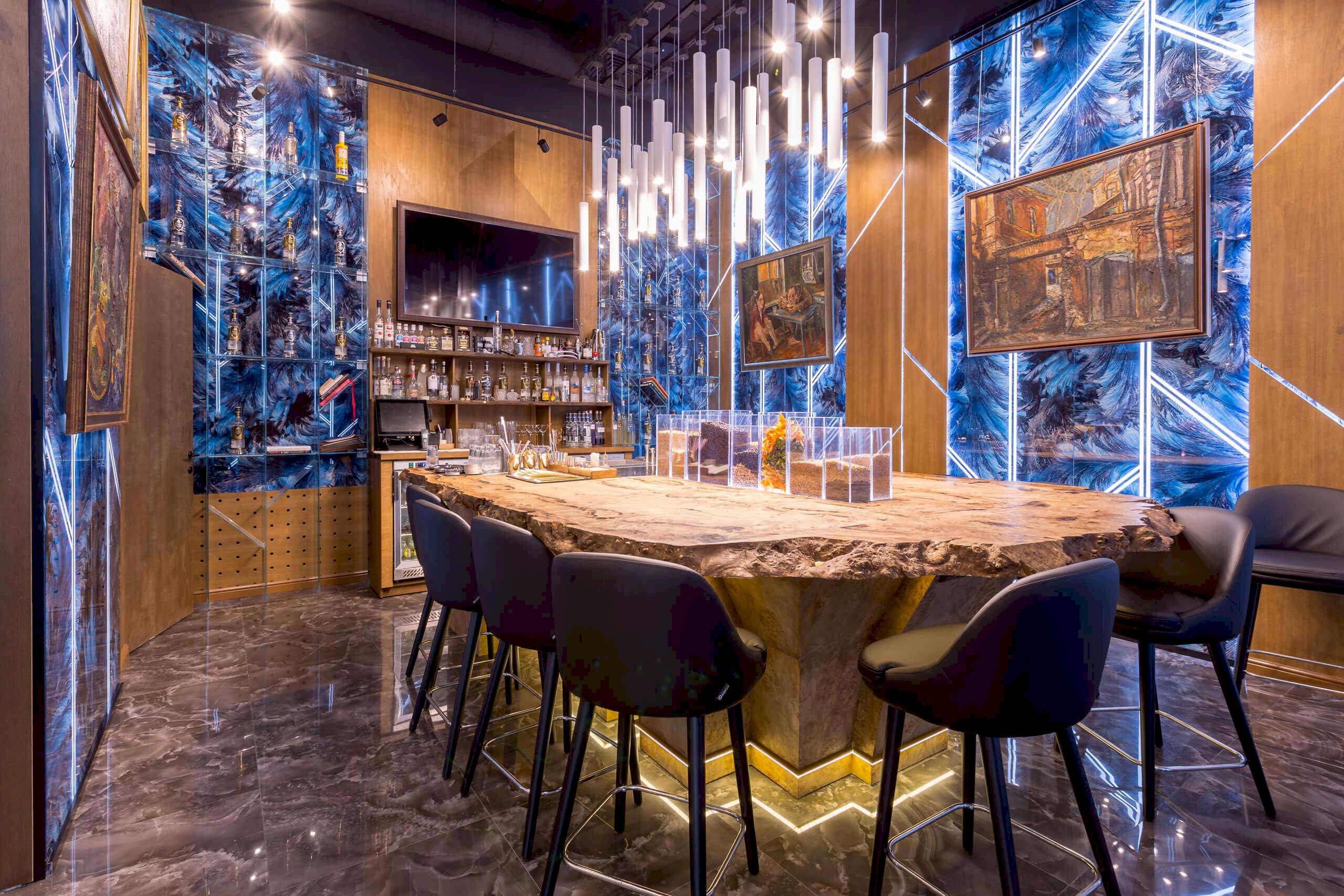 Динамичная параметрия потолков и стен в холле и кафе верхнего уровня, цветные полоски - витражи, которые смотрятся яркими брызгами на фоне пейзажа за окном, стол из состаренных досок, покрытый огромным четырехметровым сплошным стеклом, в ВИП зале, винный шкаф в холле нижнего уровня, выполненный из стекла и ярко оранжевых труб, огромный стол-слэб в "Водка Баре", 300 белоснежных светильников труб разного размера, свисающие с потолка в банкетном зале, стены, отделанные геометрическим коллажом из зеркал, шпонированной фанеры, стекла с УФ печатью под различные породы камней, и огромные трех-с-половиной-метровые двери в санузлы, задекорированные декоративной штукатуркой под бетон, камень и дерево. На воплощение всего объекта вместе с проектными и отделочными работами нам понадобилось 12 месяцев.
