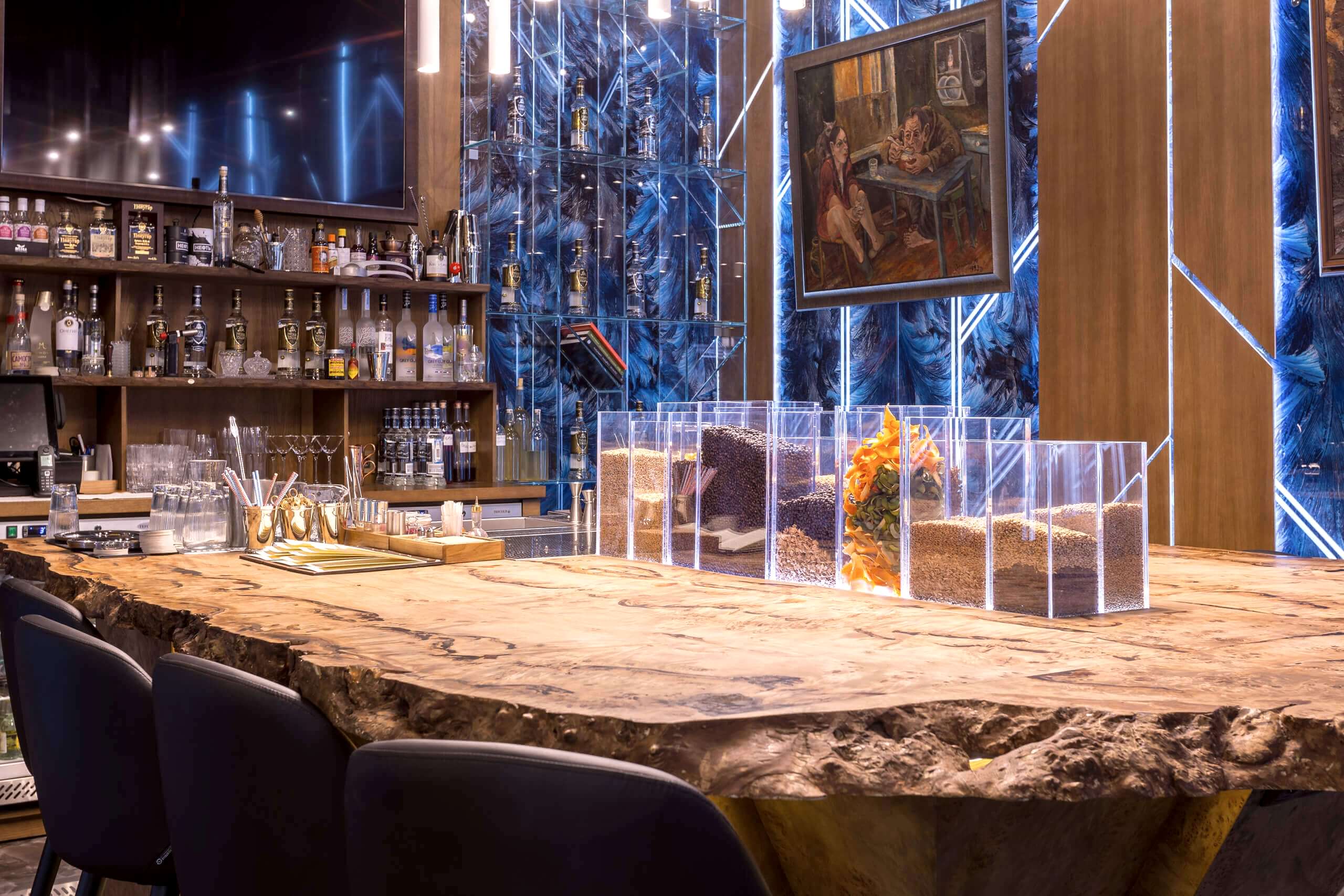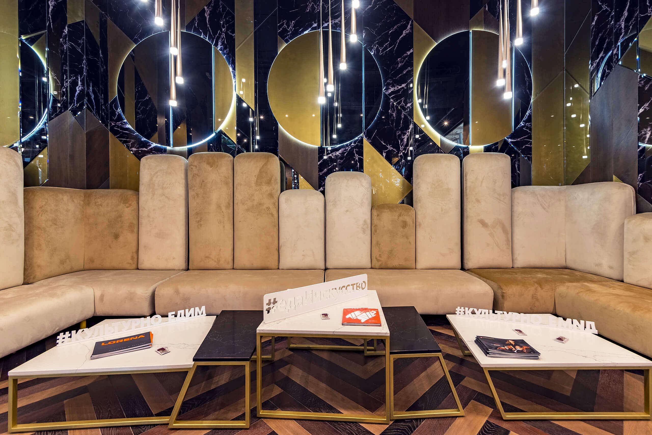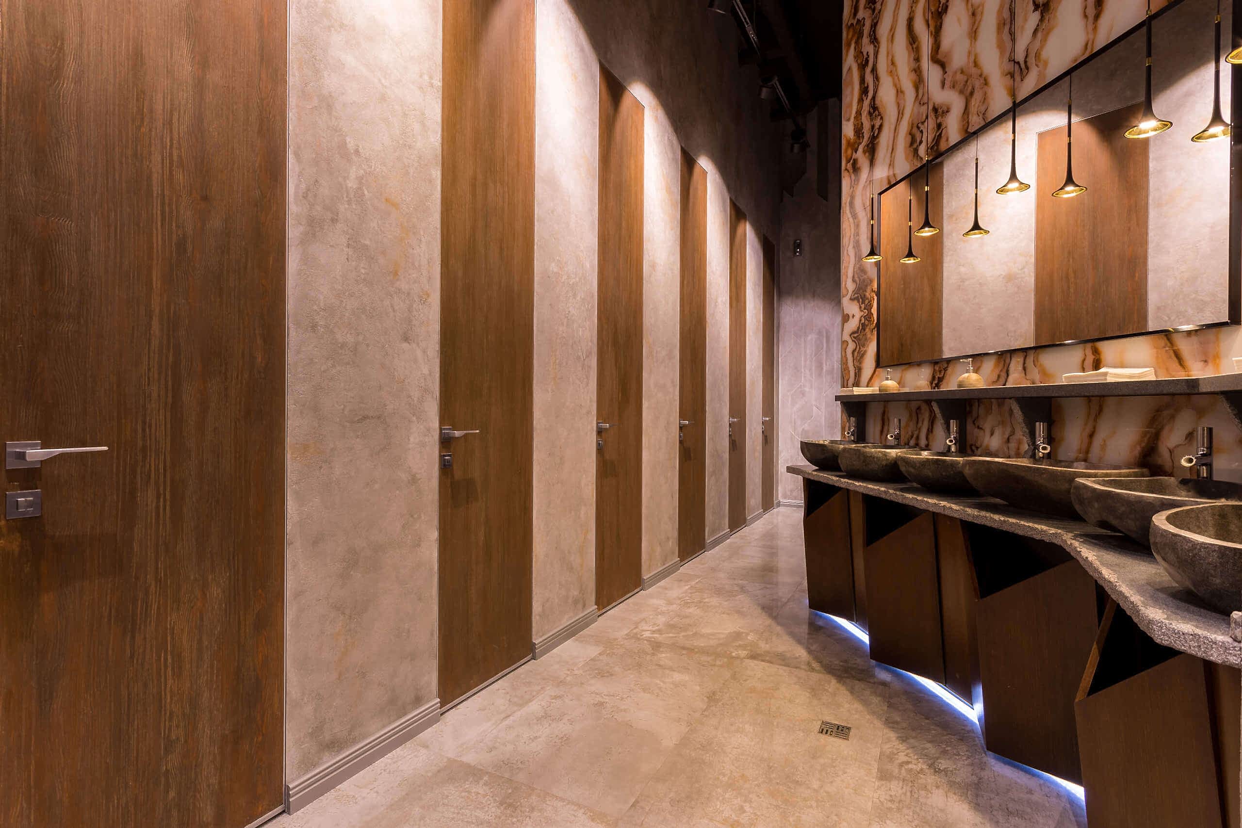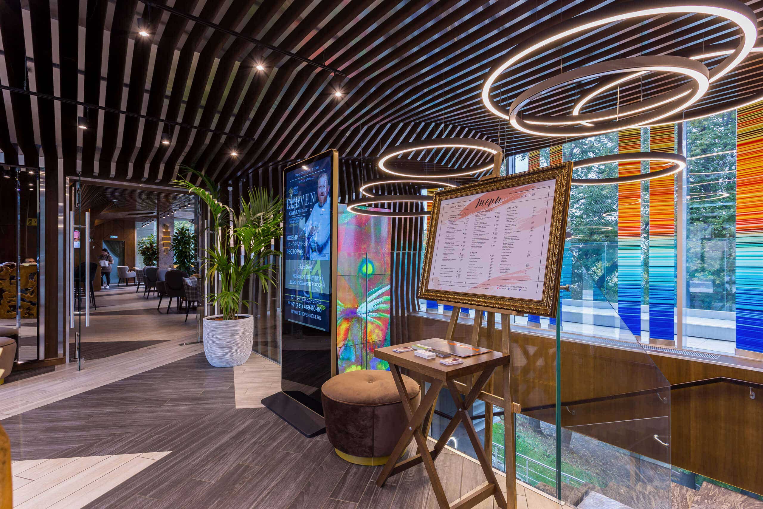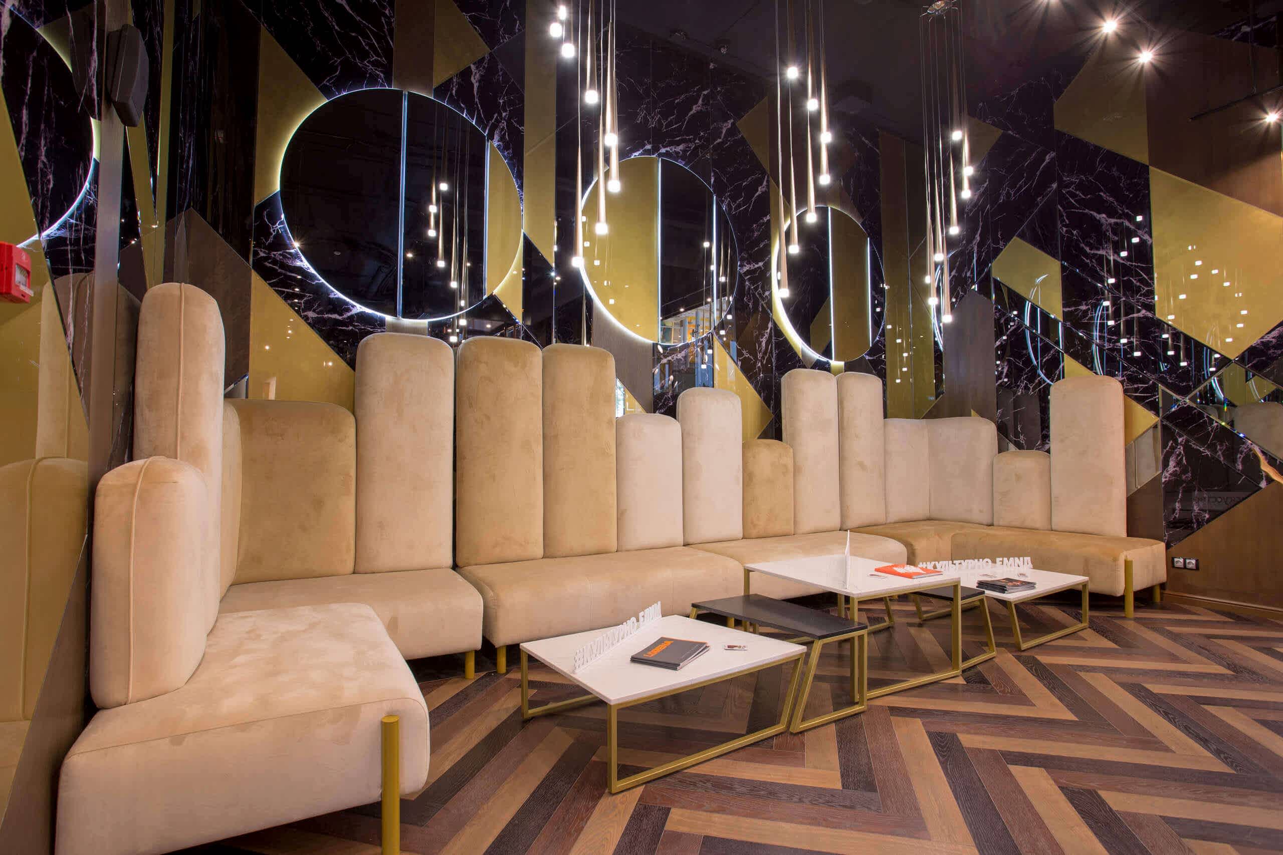 Динамичная параметрия потолков и стен в холле и кафе верхнего уровня, цветные полоски - витражи, которые смотрятся яркими брызгами на фоне пейзажа за окном, стол из состаренных досок, покрытый огромным четырехметровым сплошным стеклом, в ВИП зале, винный шкаф в холле нижнего уровня, выполненный из стекла и ярко оранжевых труб, огромный стол-слэб в "Водка Баре", 300 белоснежных светильников труб разного размера, свисающие с потолка в банкетном зале, стены, отделанные геометрическим коллажом из зеркал, шпонированной фанеры, стекла с УФ печатью под различные породы камней, и огромные трех-с-половиной-метровые двери в санузлы, задекорированные декоративной штукатуркой под бетон, камень и дерево. На воплощение всего объекта вместе с проектными и отделочными работами нам понадобилось 12 месяцев.