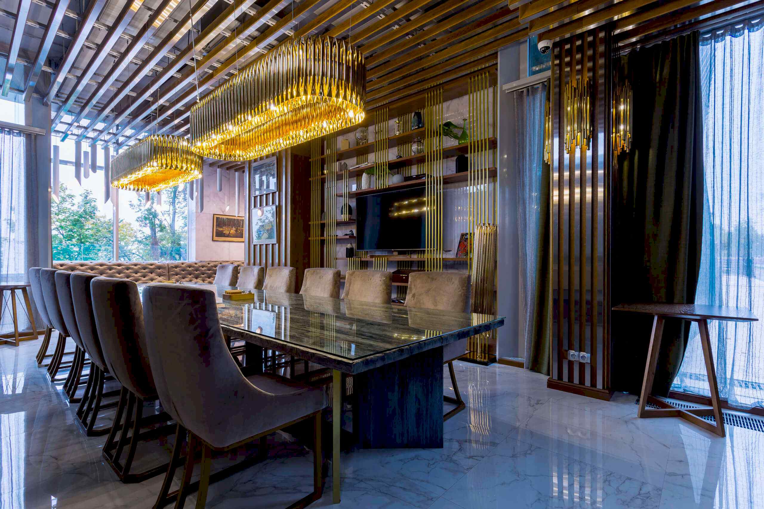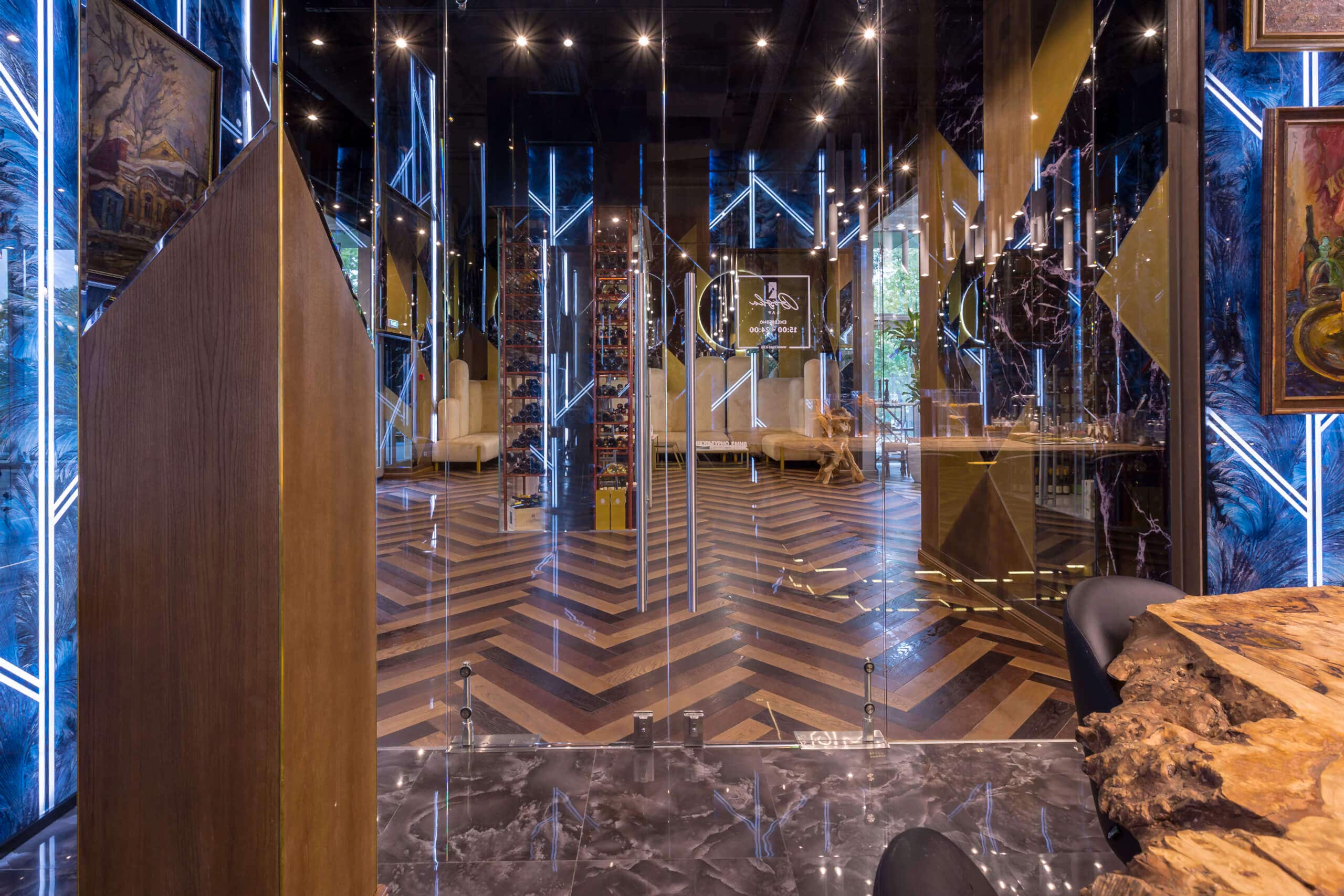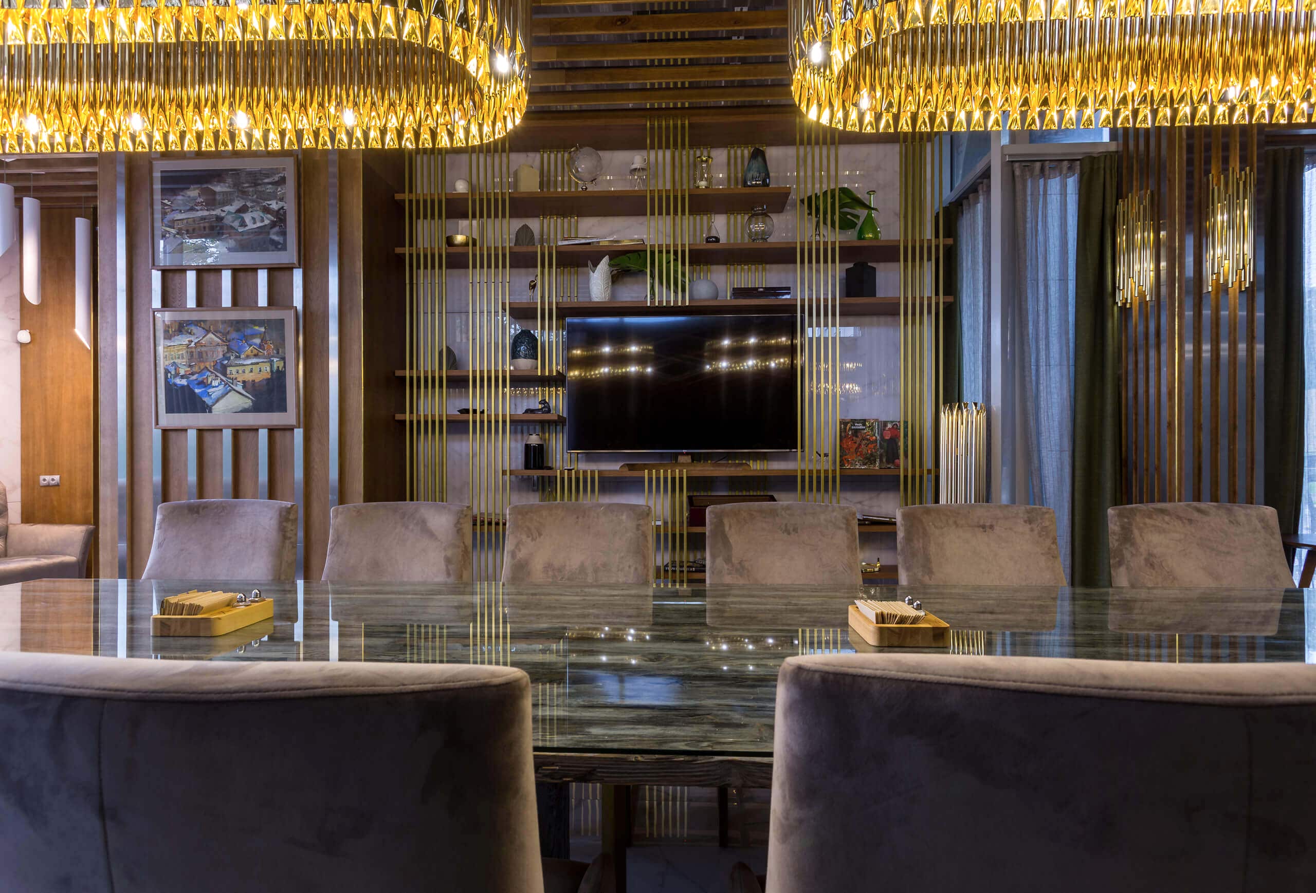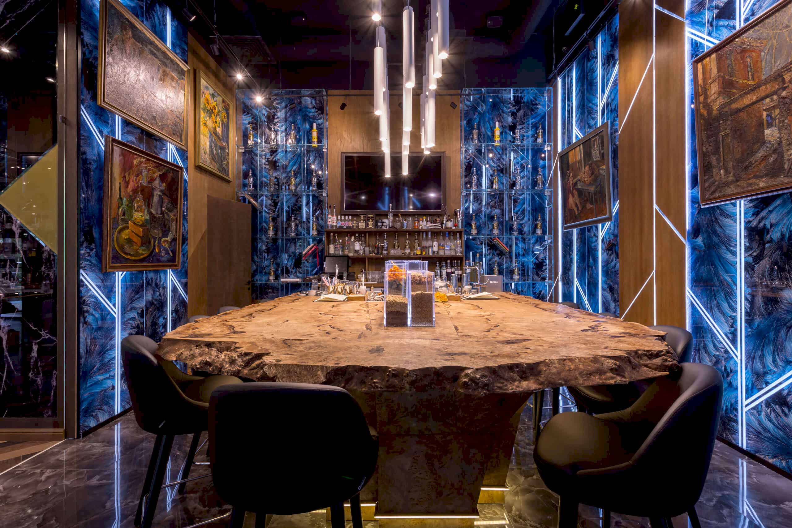 Динамичная параметрия потолков и стен в холле и кафе верхнего уровня, цветные полоски - витражи, которые смотрятся яркими брызгами на фоне пейзажа за окном, стол из состаренных досок, покрытый огромным четырехметровым сплошным стеклом, в ВИП зале, винный шкаф в холле нижнего уровня, выполненный из стекла и ярко оранжевых труб, огромный стол-слэб в "Водка Баре", 300 белоснежных светильников труб разного размера, свисающие с потолка в банкетном зале, стены, отделанные геометрическим коллажом из зеркал, шпонированной фанеры, стекла с УФ печатью под различные породы камней, и огромные трех-с-половиной-метровые двери в санузлы, задекорированные декоративной штукатуркой под бетон, камень и дерево. На воплощение всего объекта вместе с проектными и отделочными работами нам понадобилось 12 месяцев.