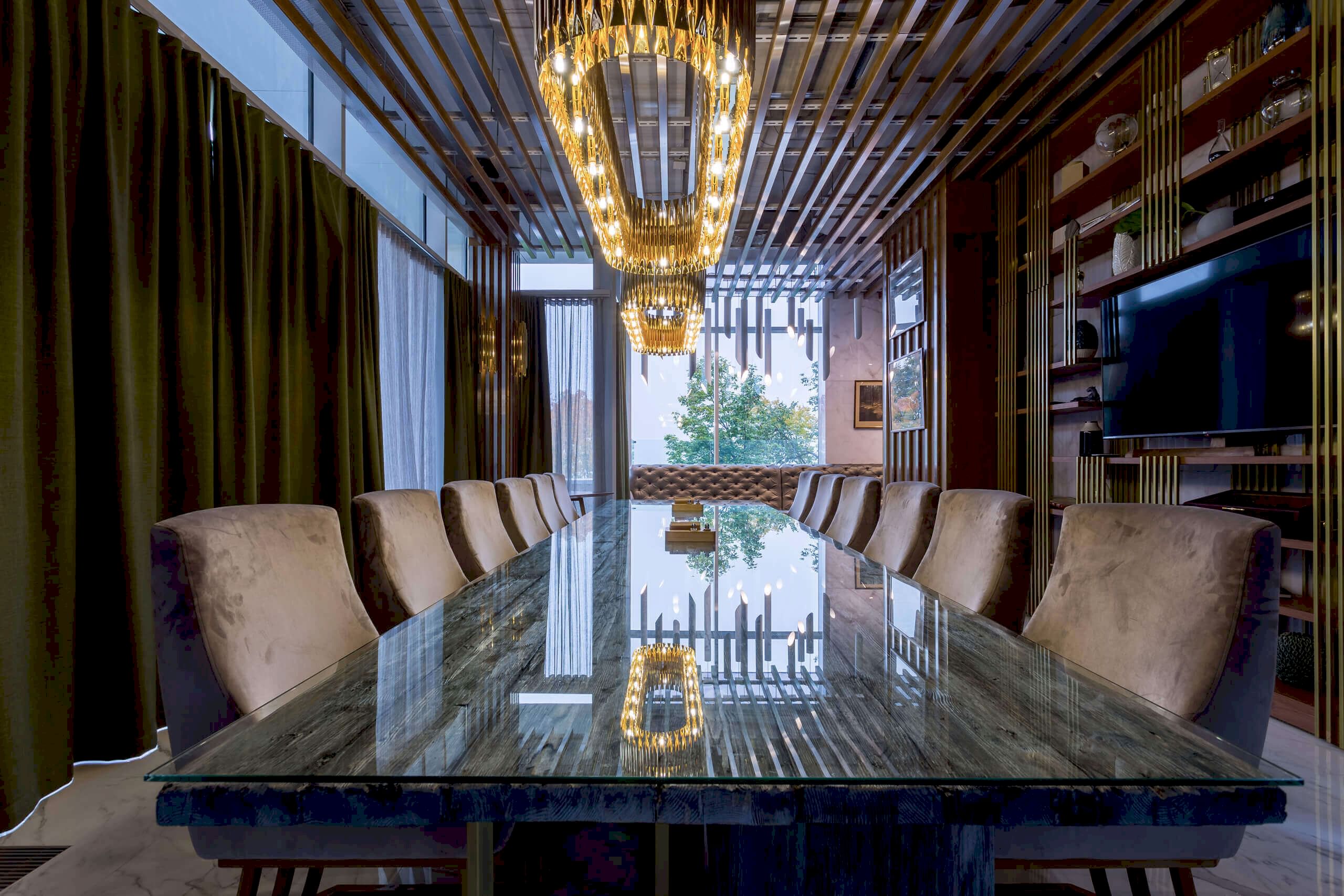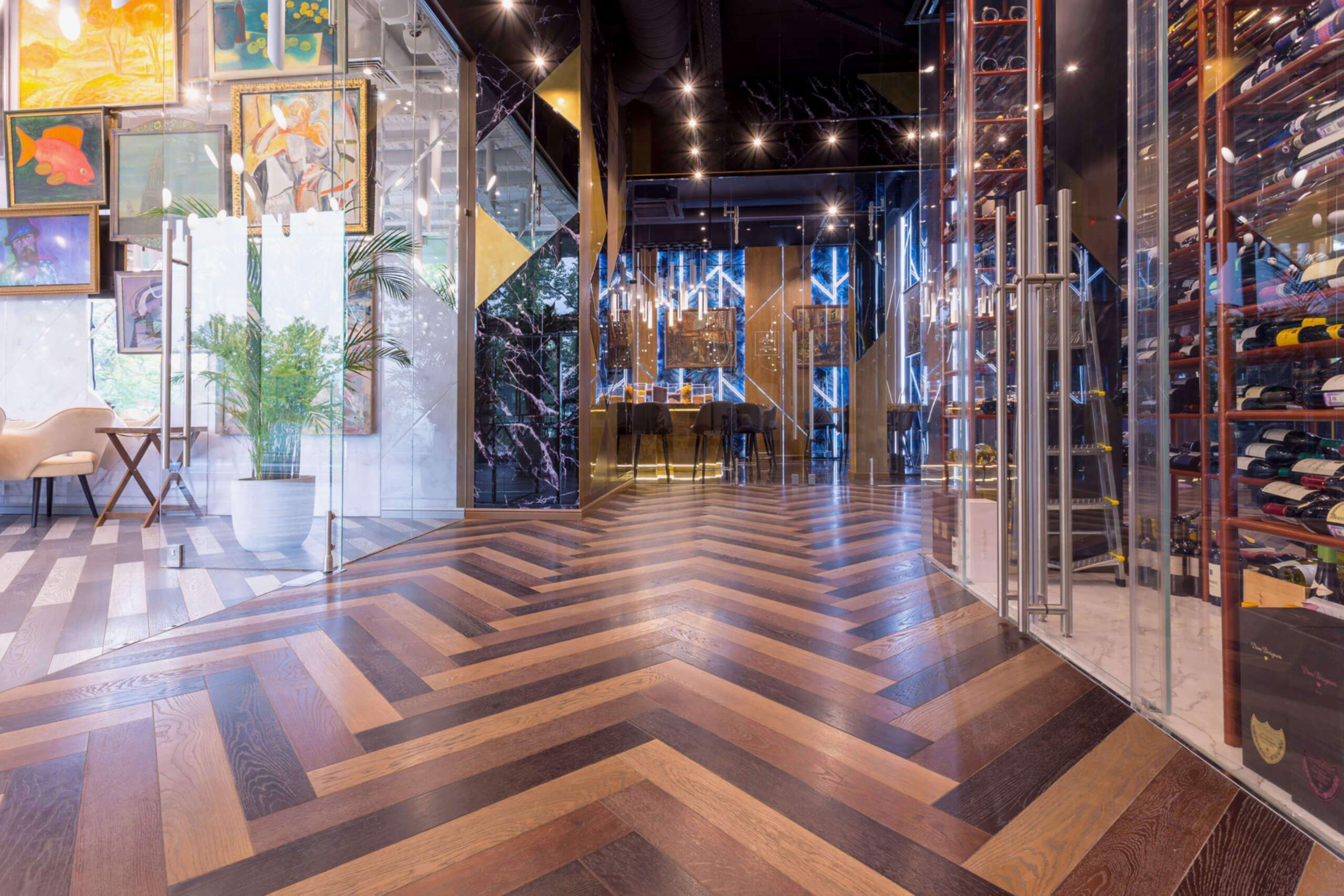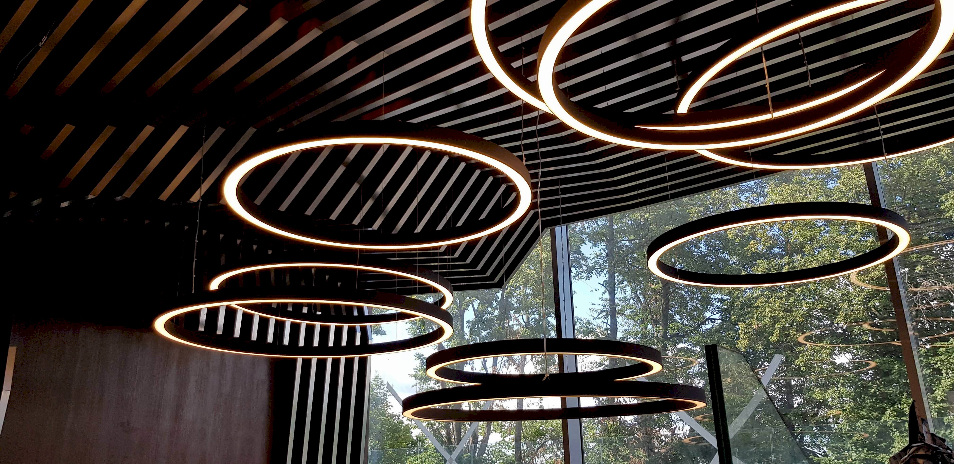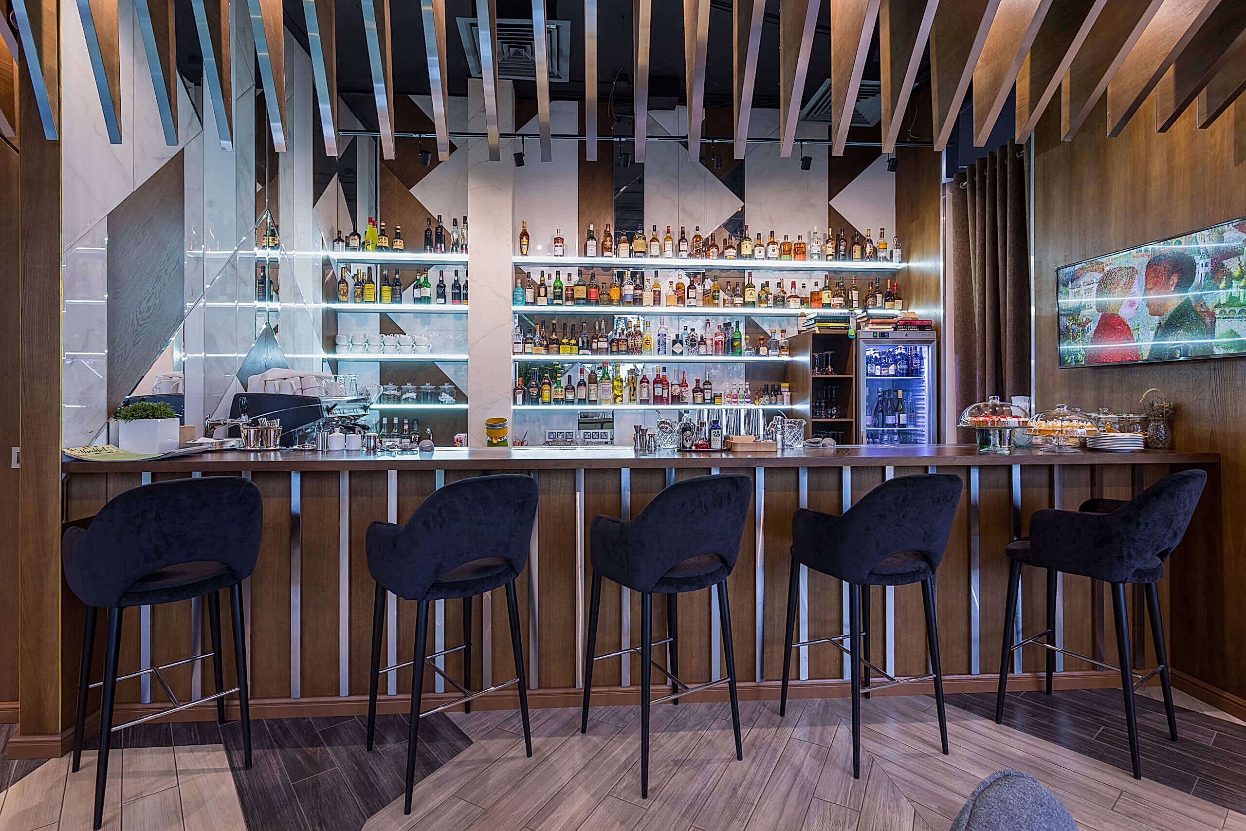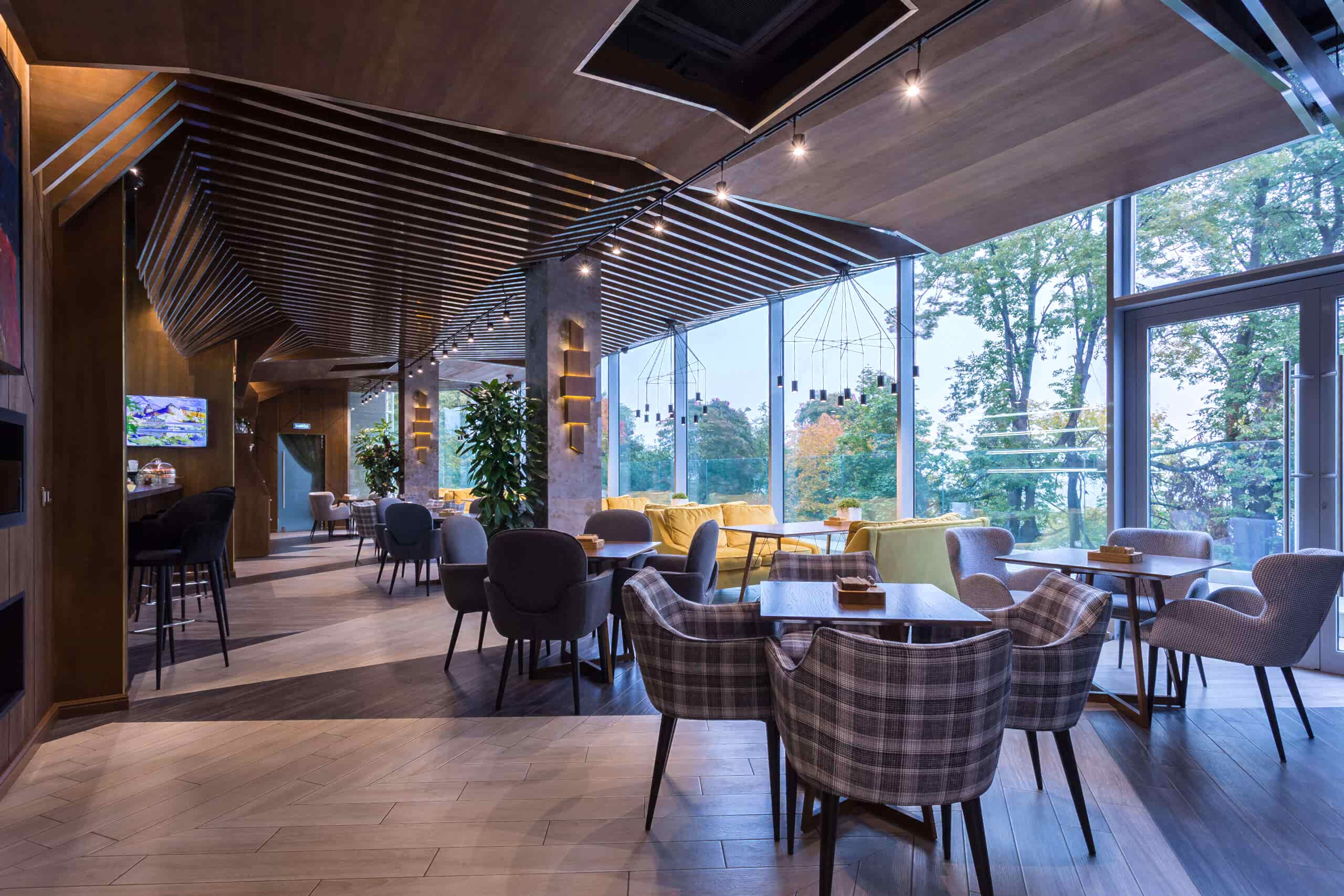 Динамичная параметрия потолков и стен в холле и кафе верхнего уровня, цветные полоски - витражи, которые смотрятся яркими брызгами на фоне пейзажа за окном, стол из состаренных досок, покрытый огромным четырехметровым сплошным стеклом, в ВИП зале, винный шкаф в холле нижнего уровня, выполненный из стекла и ярко оранжевых труб, огромный стол-слэб в "Водка Баре", 300 белоснежных светильников труб разного размера, свисающие с потолка в банкетном зале, стены, отделанные геометрическим коллажом из зеркал, шпонированной фанеры, стекла с УФ печатью под различные породы камней, и огромные трех-с-половиной-метровые двери в санузлы, задекорированные декоративной штукатуркой под бетон, камень и дерево. На воплощение всего объекта вместе с проектными и отделочными работами нам понадобилось 12 месяцев.