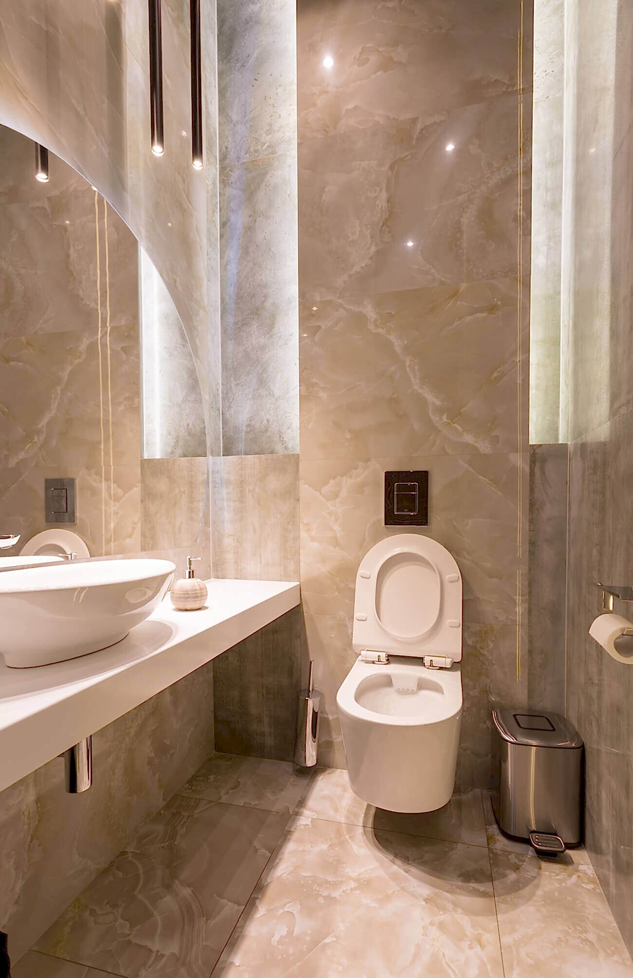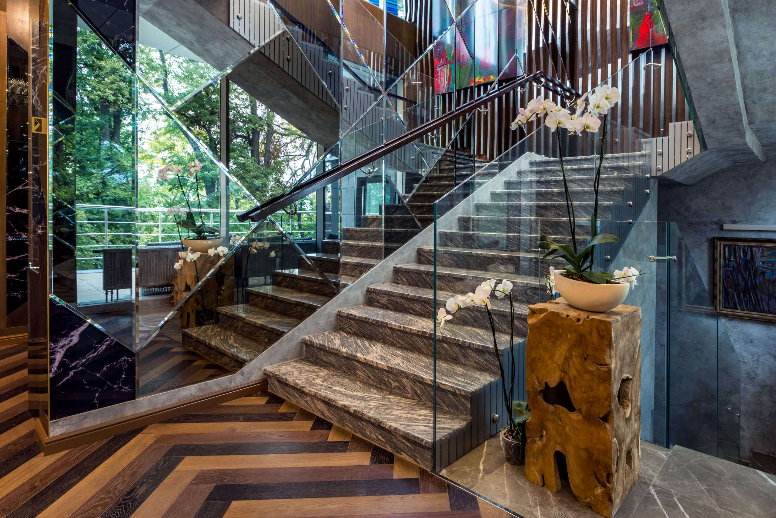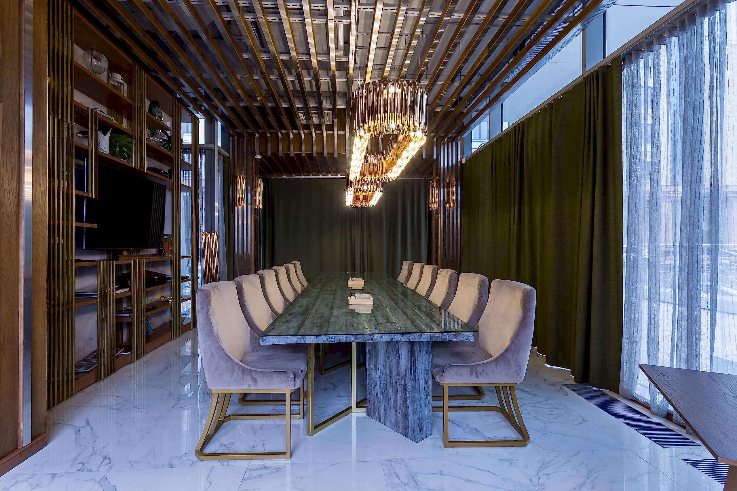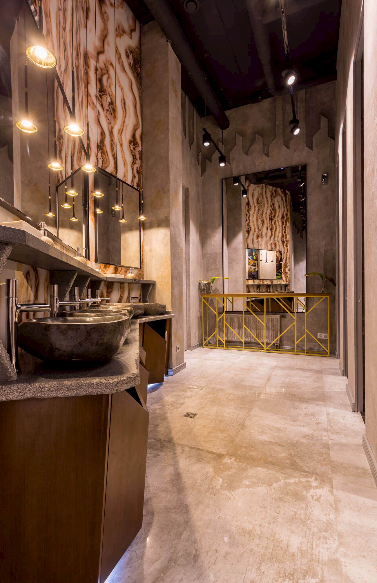 Динамичная параметрия потолков и стен в холле и кафе верхнего уровня, цветные полоски - витражи, которые смотрятся яркими брызгами на фоне пейзажа за окном, стол из состаренных досок, покрытый огромным четырехметровым сплошным стеклом, в ВИП зале, винный шкаф в холле нижнего уровня, выполненный из стекла и ярко оранжевых труб, огромный стол-слэб в "Водка Баре", 300 белоснежных светильников труб разного размера, свисающие с потолка в банкетном зале, стены, отделанные геометрическим коллажом из зеркал, шпонированной фанеры, стекла с УФ печатью под различные породы камней, и огромные трех-с-половиной-метровые двери в санузлы, задекорированные декоративной штукатуркой под бетон, камень и дерево. На воплощение всего объекта вместе с проектными и отделочными работами нам понадобилось 12 месяцев.