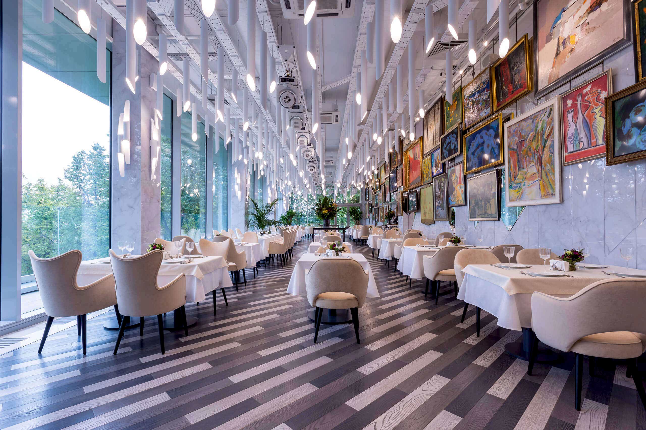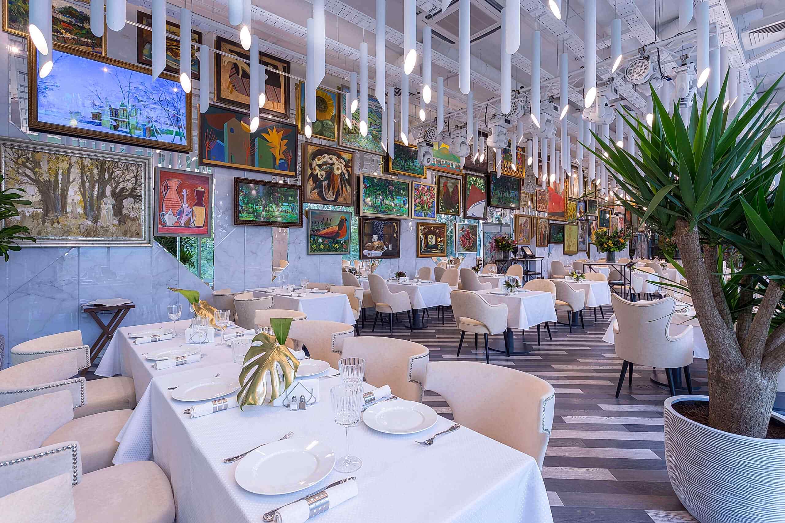 Благодаря своей сложной архитектуре (здание вписано в откос и обладает двумя уровнями-один на уровне пешеходной зоны, второй под ней и выходит витражами на парковую зону Александровского Сада, располагающегося под Набережной) ресторан решено было разделить на несколько зон, а именно — декмократичное кафе, летняя площадка и ВИП зал на верхнем уровне и банкетный зал и "Водка бар" на нижнем уровне.  В тесном творческом взаимодействии с заказчиком, который решил разместить в ресторане часть живописных полотен из своей личной коллекции, была придумана основная арт- концепция всего заведения (отсюда и название-"Парк Культуры") и воплощены в жизнь все смелые и яркие авторские идеи нашей студии.