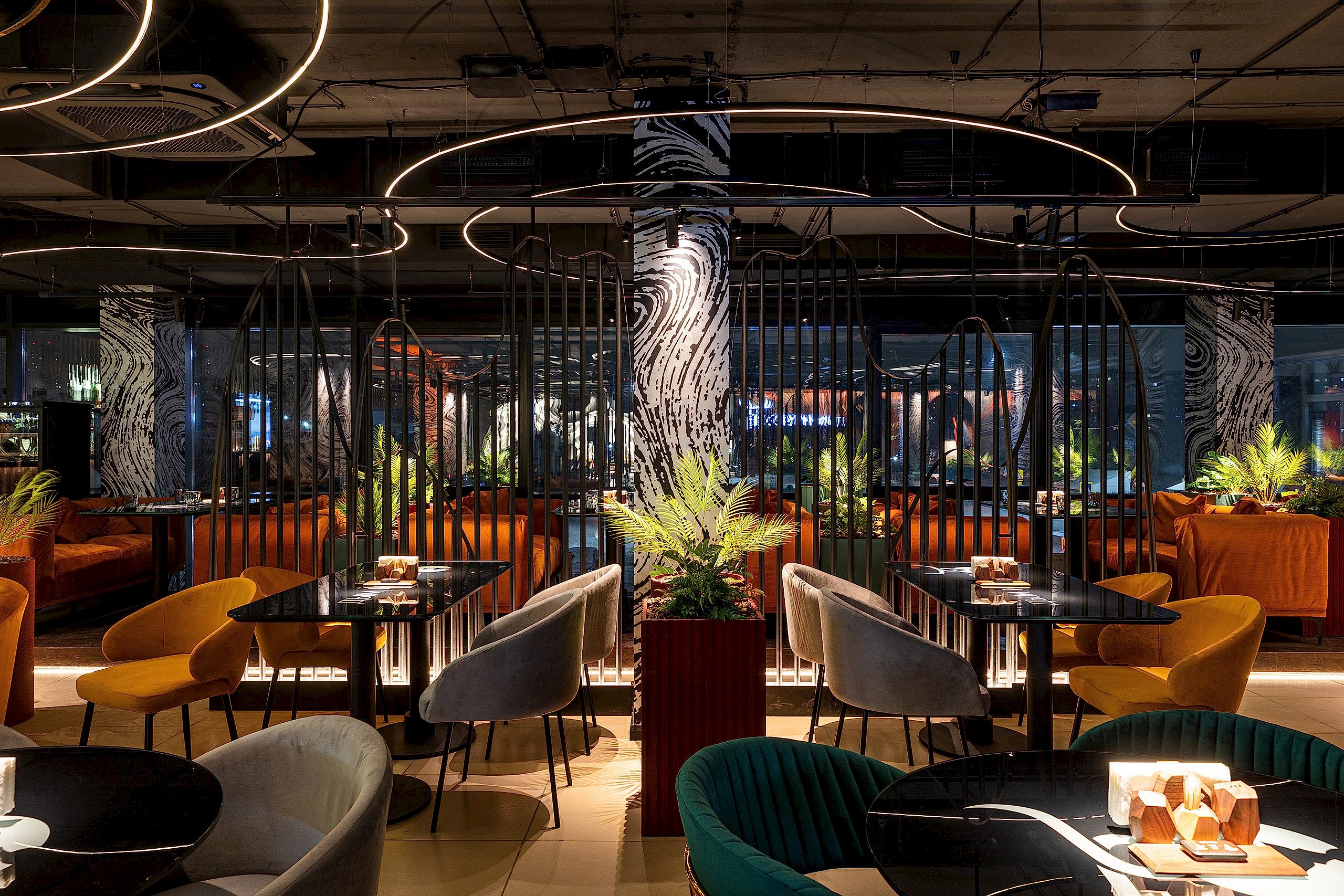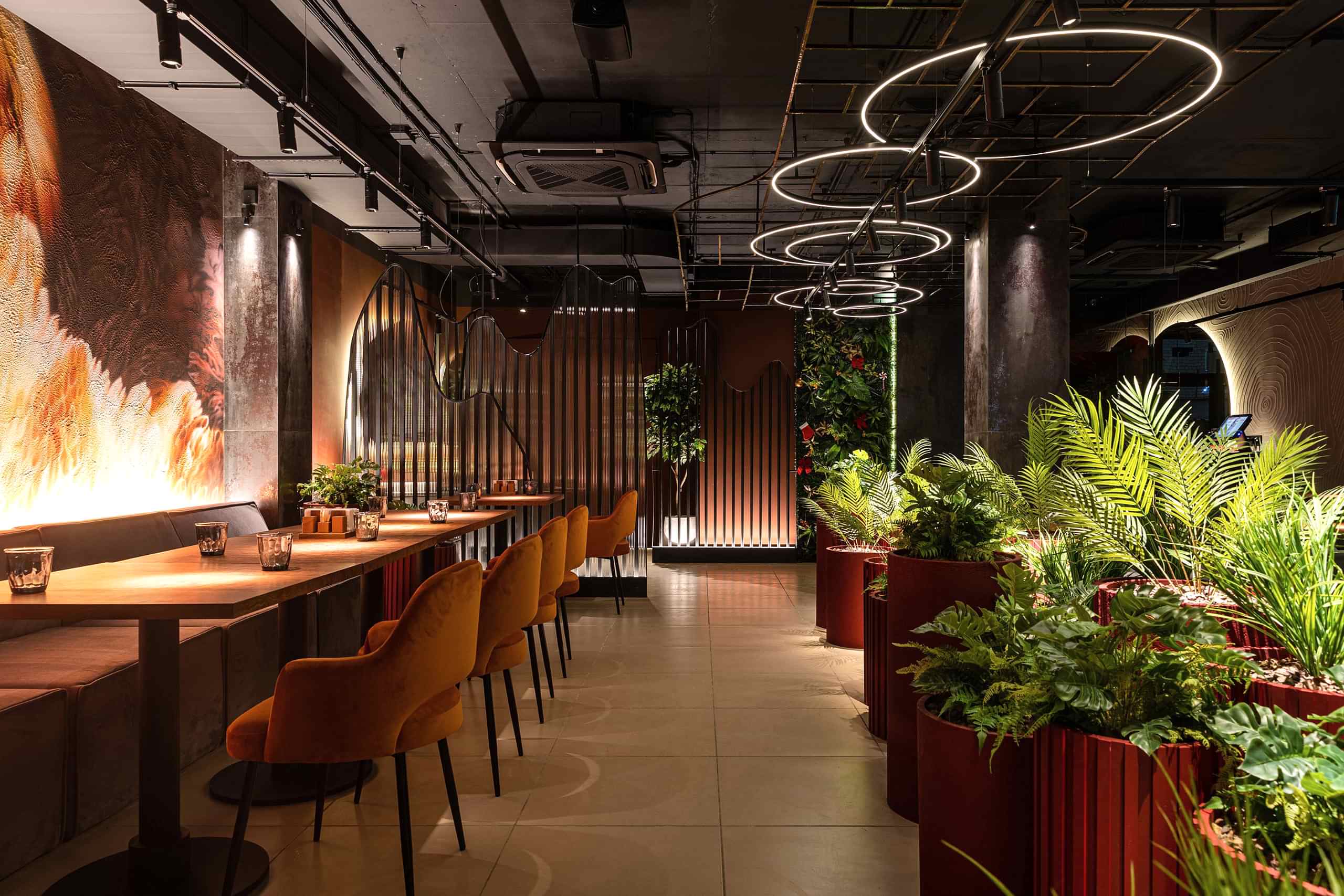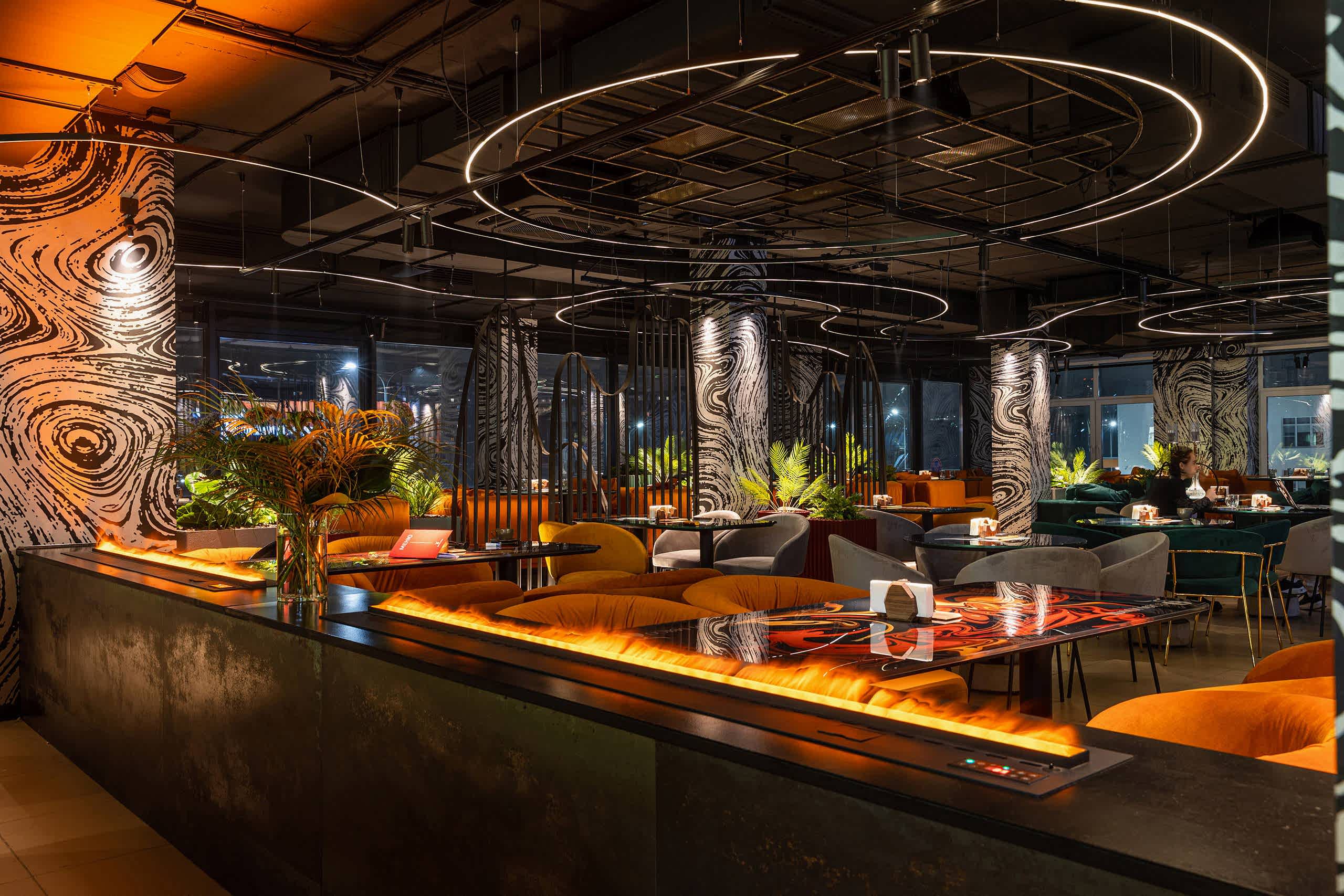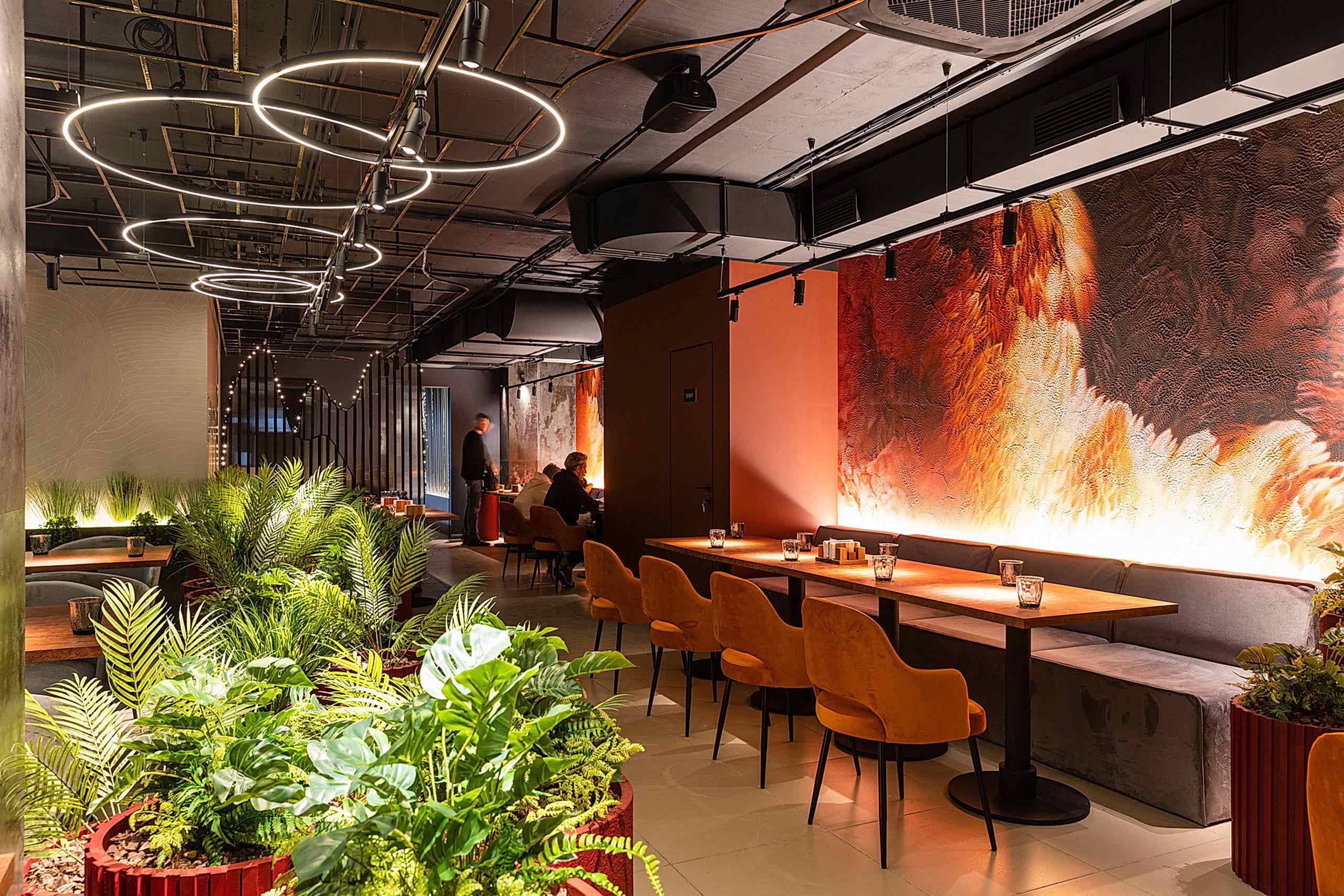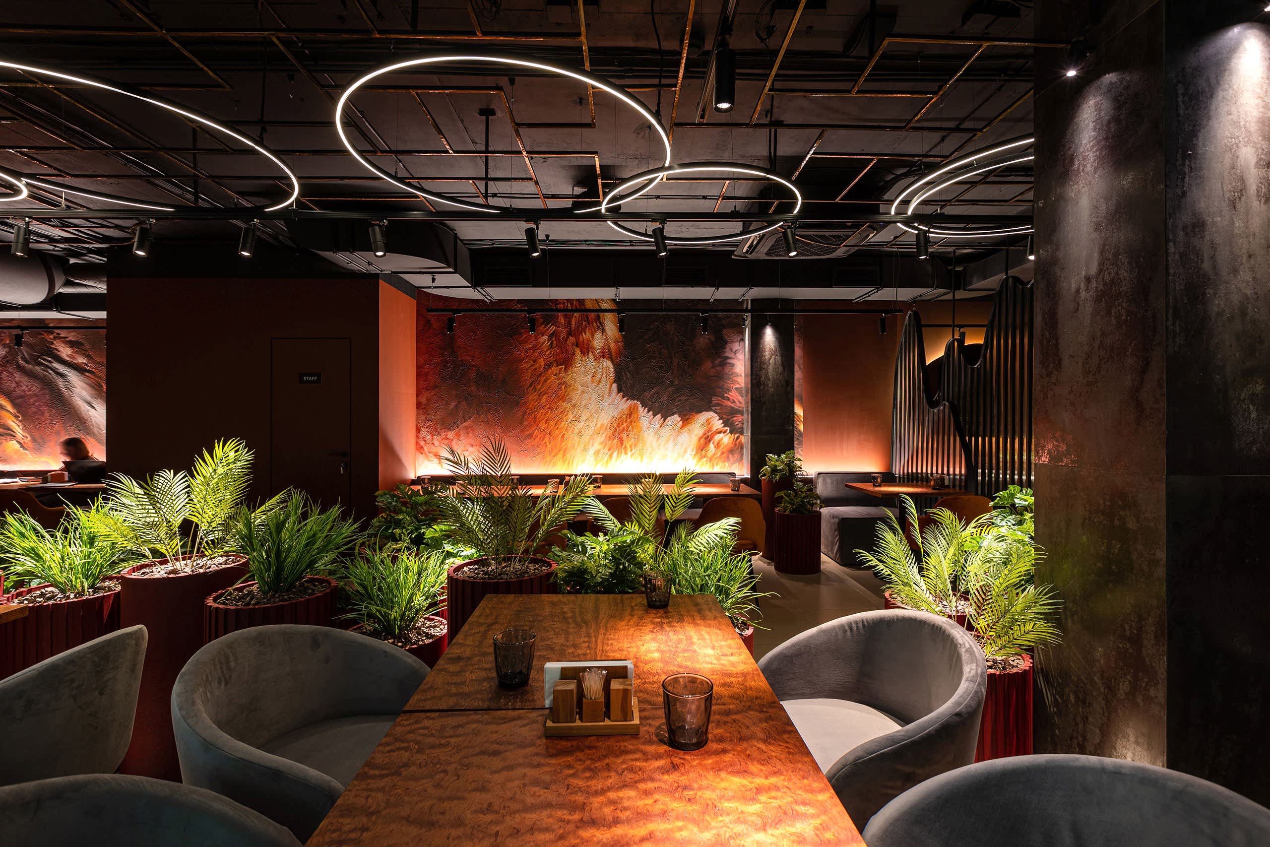Совмещая актуальную палитру цветов, современные отделочные материалы, интересные нетривиальные решения по декору интерьера и авторскую графику, дизайнеры создали поистине оригинальное пространство, ничуть не уступающее заведениям, располагающимся в центре города. Заказчик - предприниматель с опытом, ответственно подошел к созданию данного проекта и воплотил его на сто процентов, что является, несомненно, большим успехом для дизайнера, поэтому мы создавали его с вдохновением и принимали участие в нем с самого начала и до завершения, разрабатывая вместе с заказчиком каждую оригинальную деталь ресторана, будь то бионические панно на стенах, фреска, передающая ощущение огня, или причудливо изогнутые светильники на потолке главного зала.
