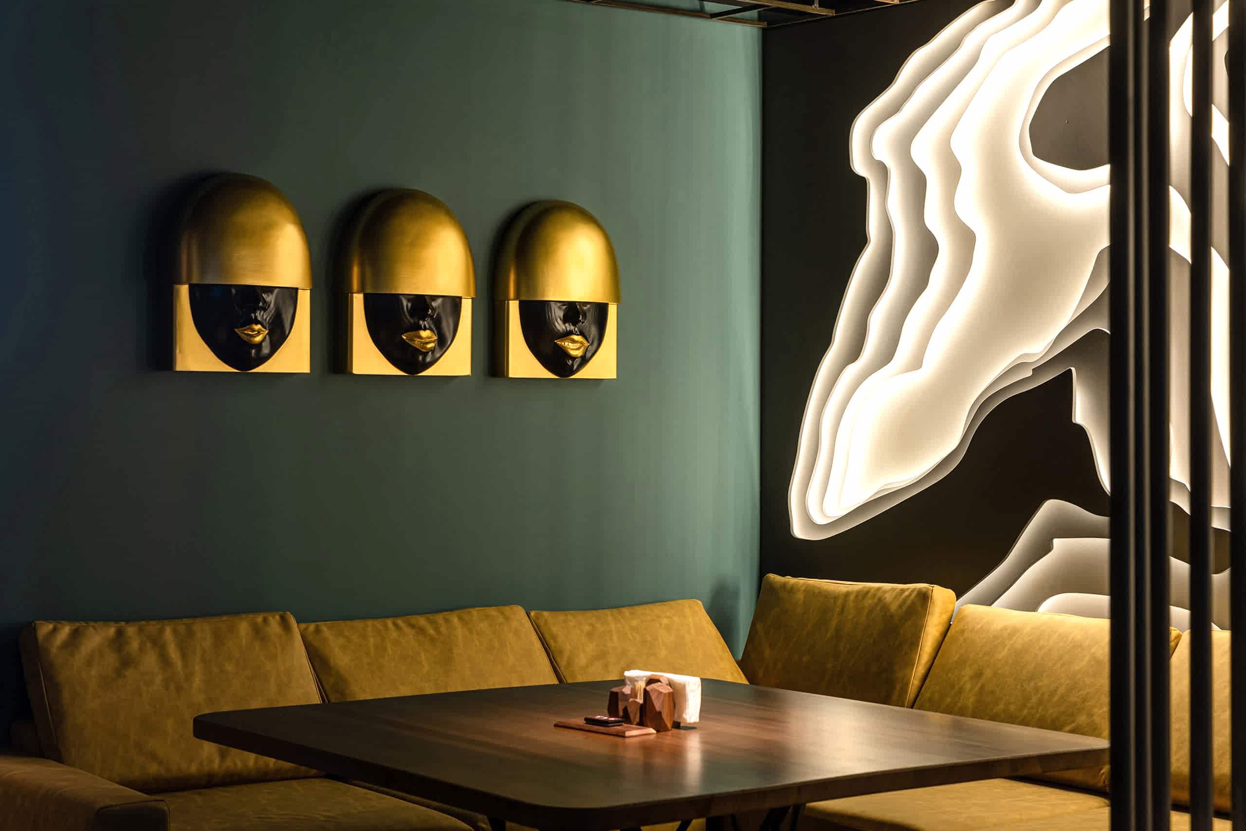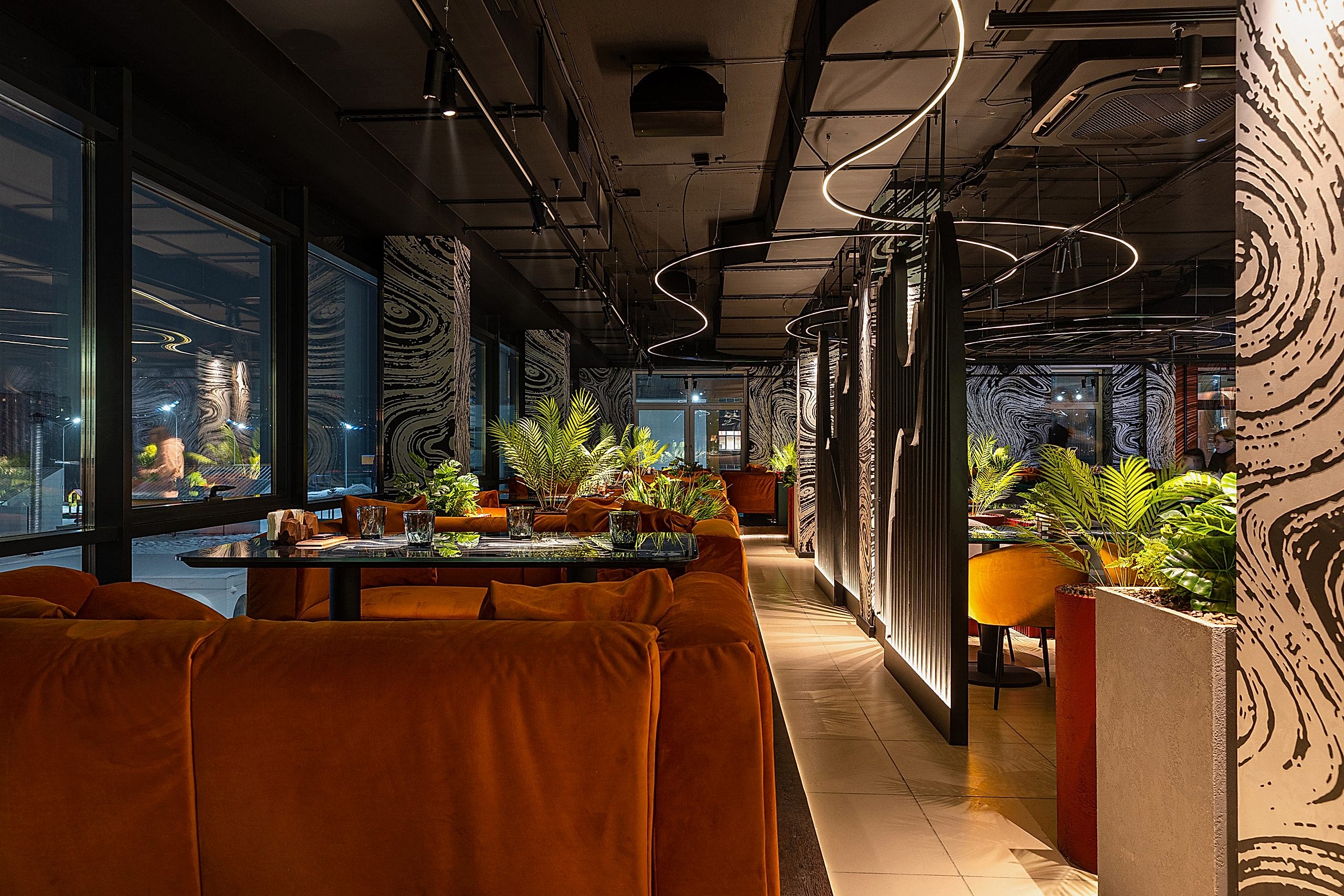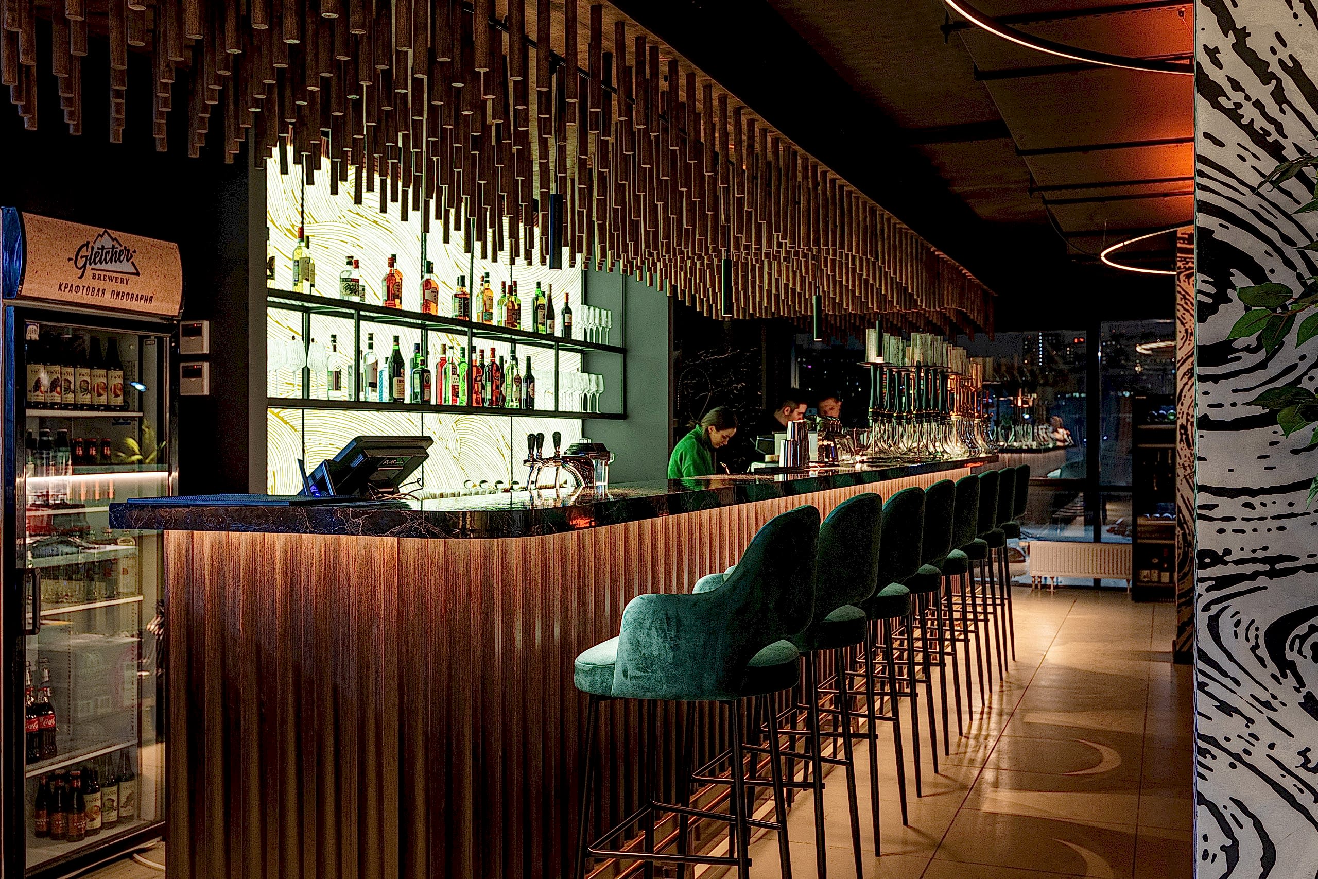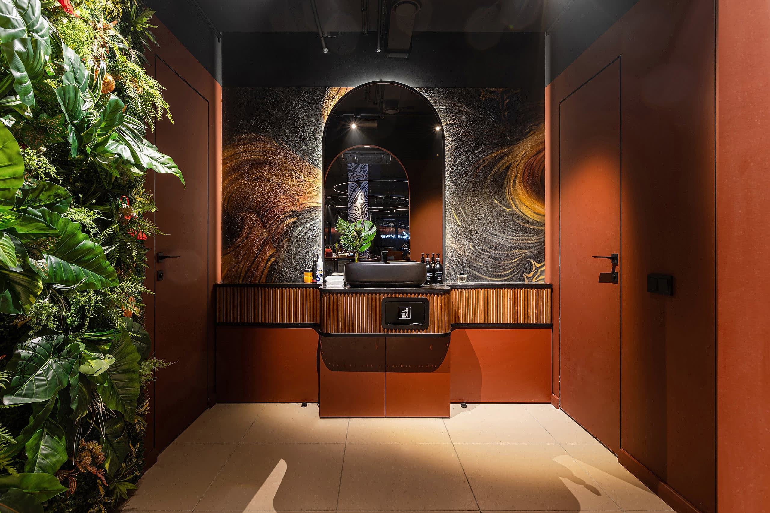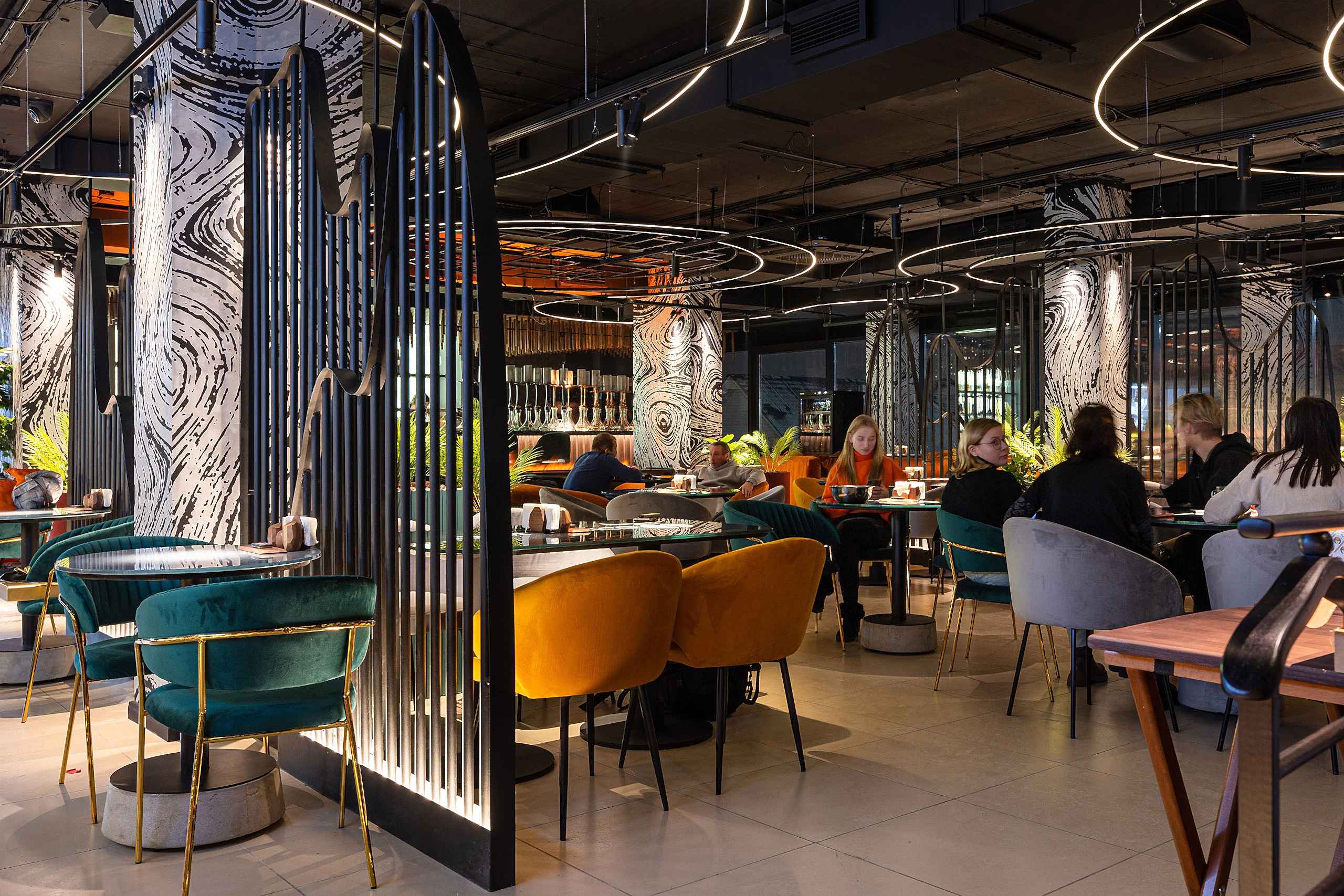 Совмещая актуальную палитру цветов, современные отделочные материалы, интересные нетривиальные решения по декору интерьера и авторскую графику, дизайнеры создали поистине оригинальное пространство, ничуть не уступающее заведениям, располагающимся в центре города. Заказчик - предприниматель с опытом, ответственно подошел к созданию данного проекта и воплотил его на сто процентов, что является, несомненно, большим успехом для дизайнера, поэтому мы создавали его с вдохновением и принимали участие в нем с самого начала и до завершения, разрабатывая вместе с заказчиком каждую оригинальную деталь ресторана, будь то бионические панно на стенах, фреска, передающая ощущение огня, или причудливо изогнутые светильники на потолке главного зала.