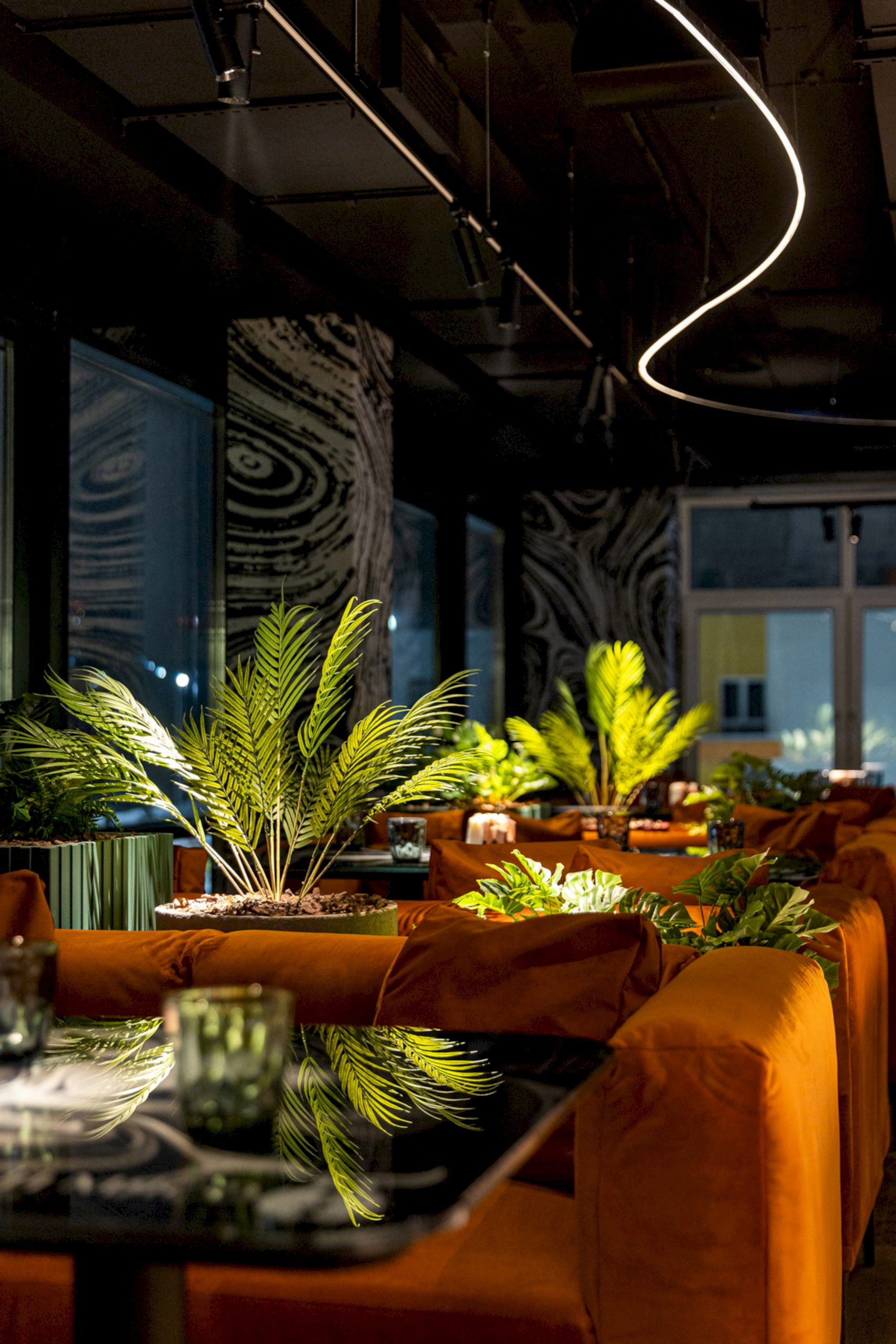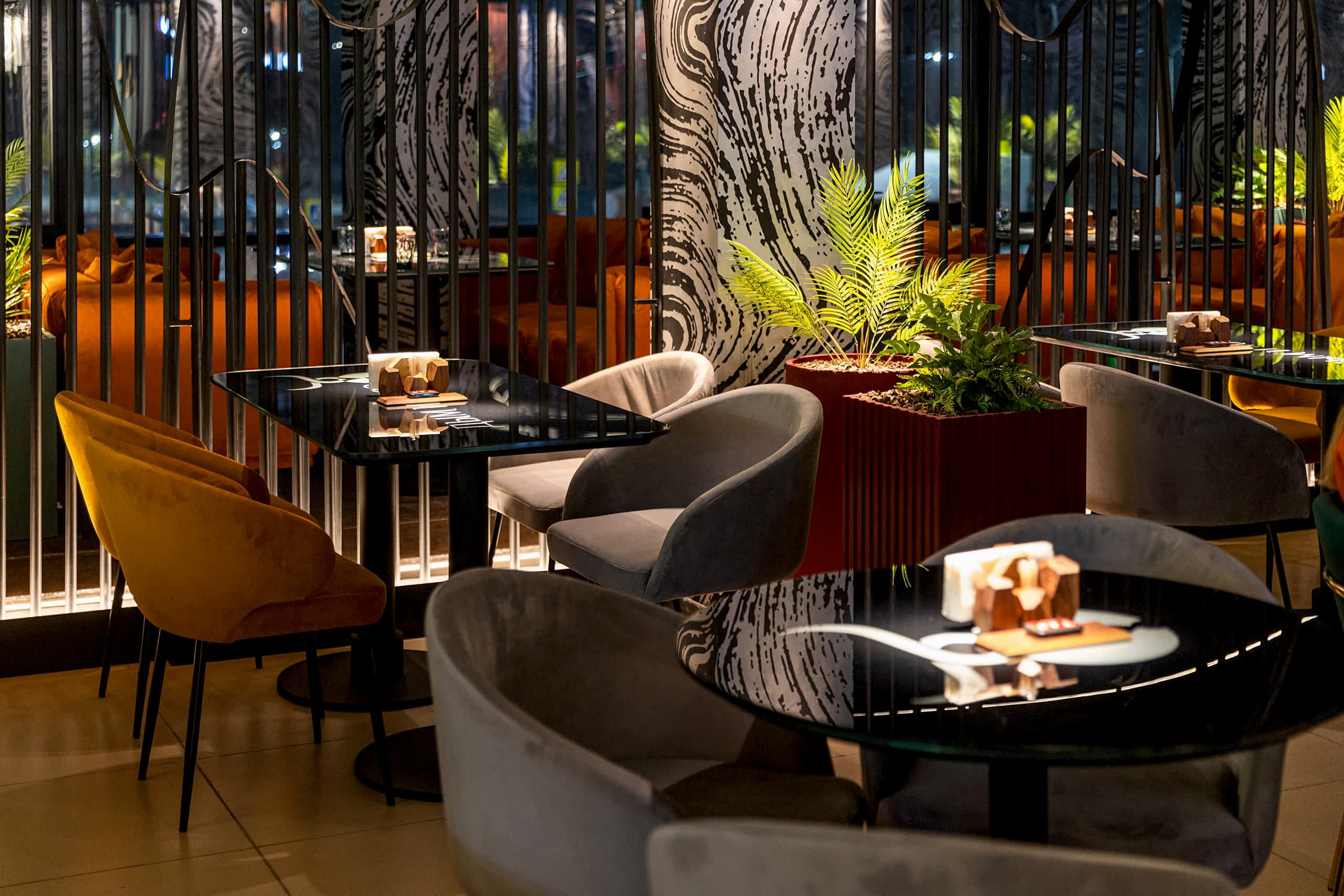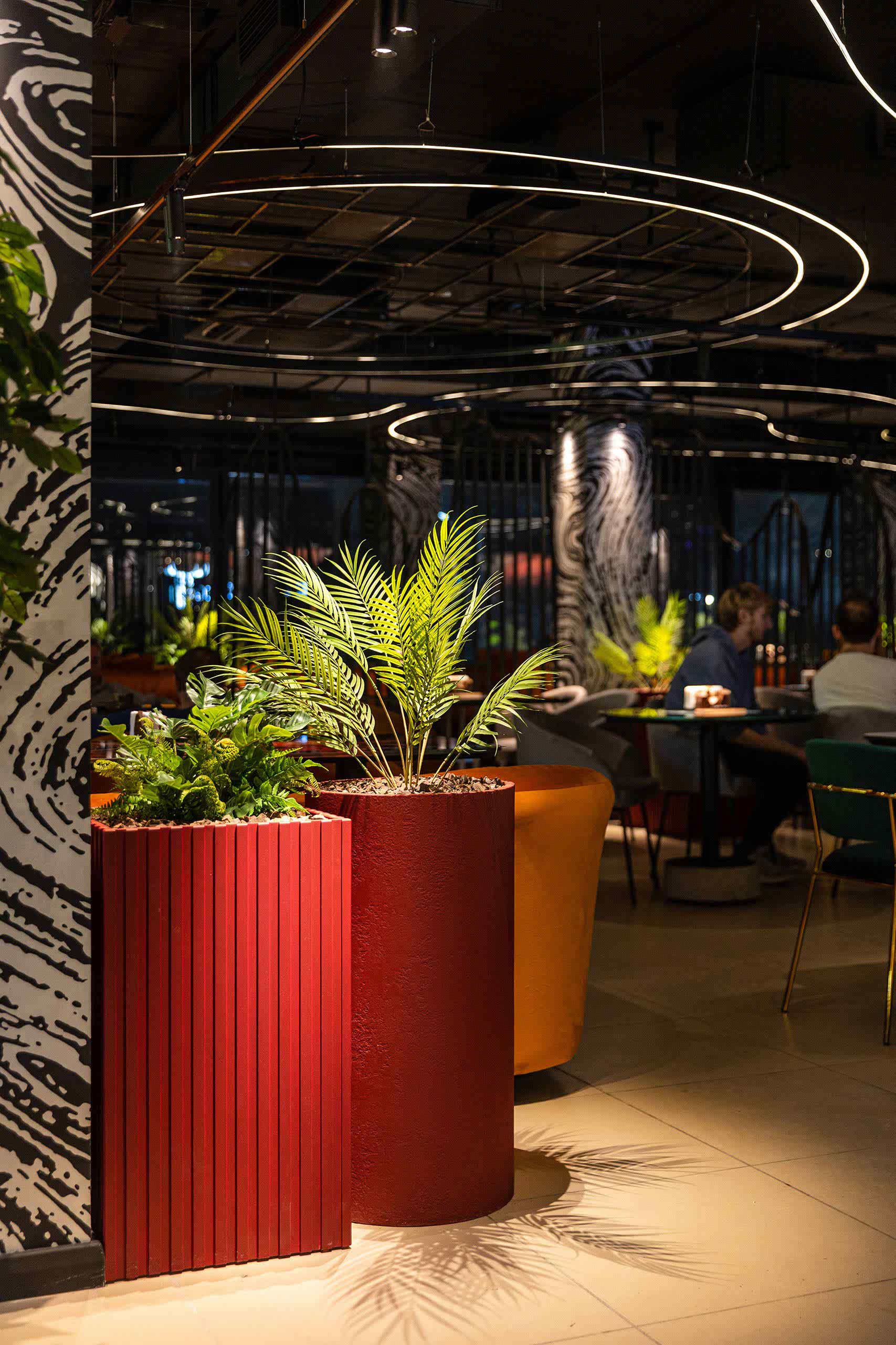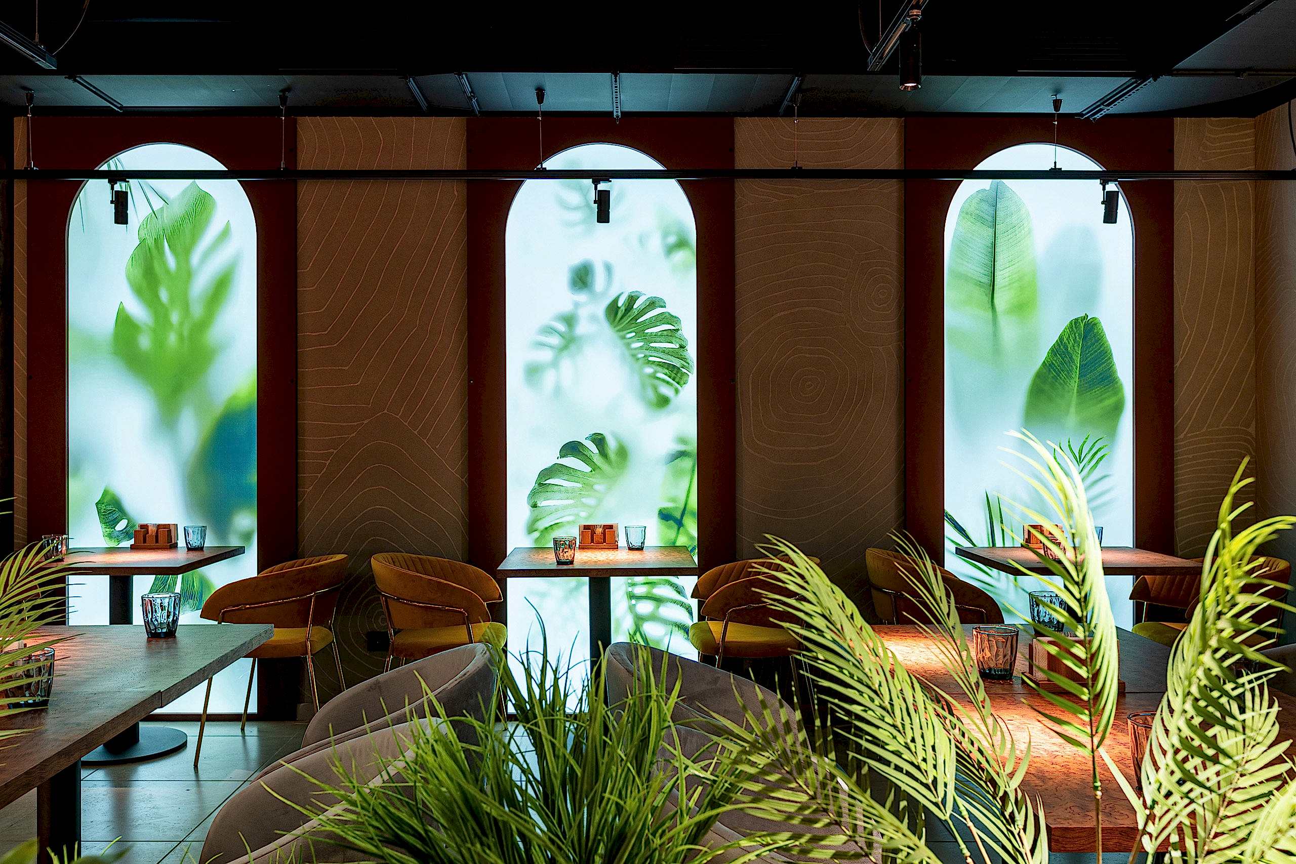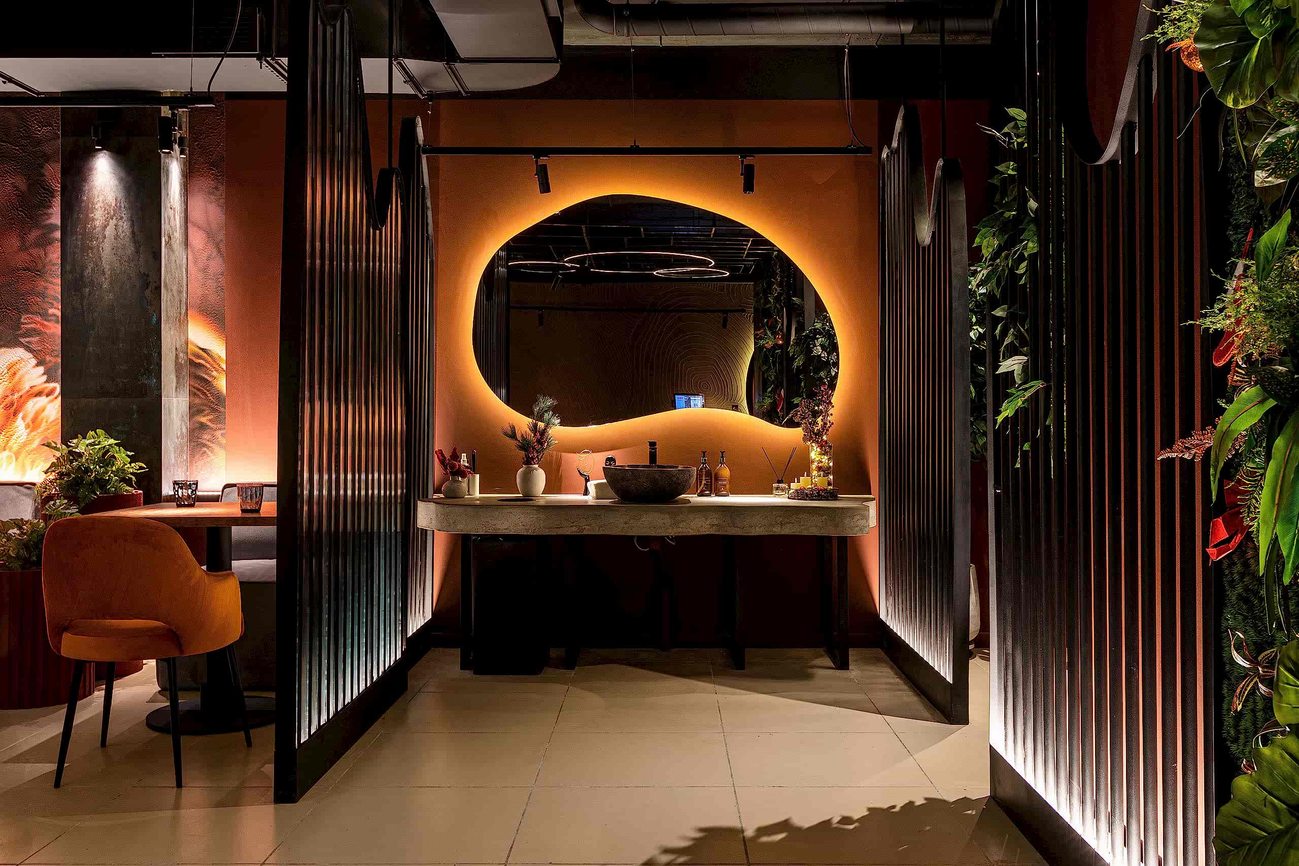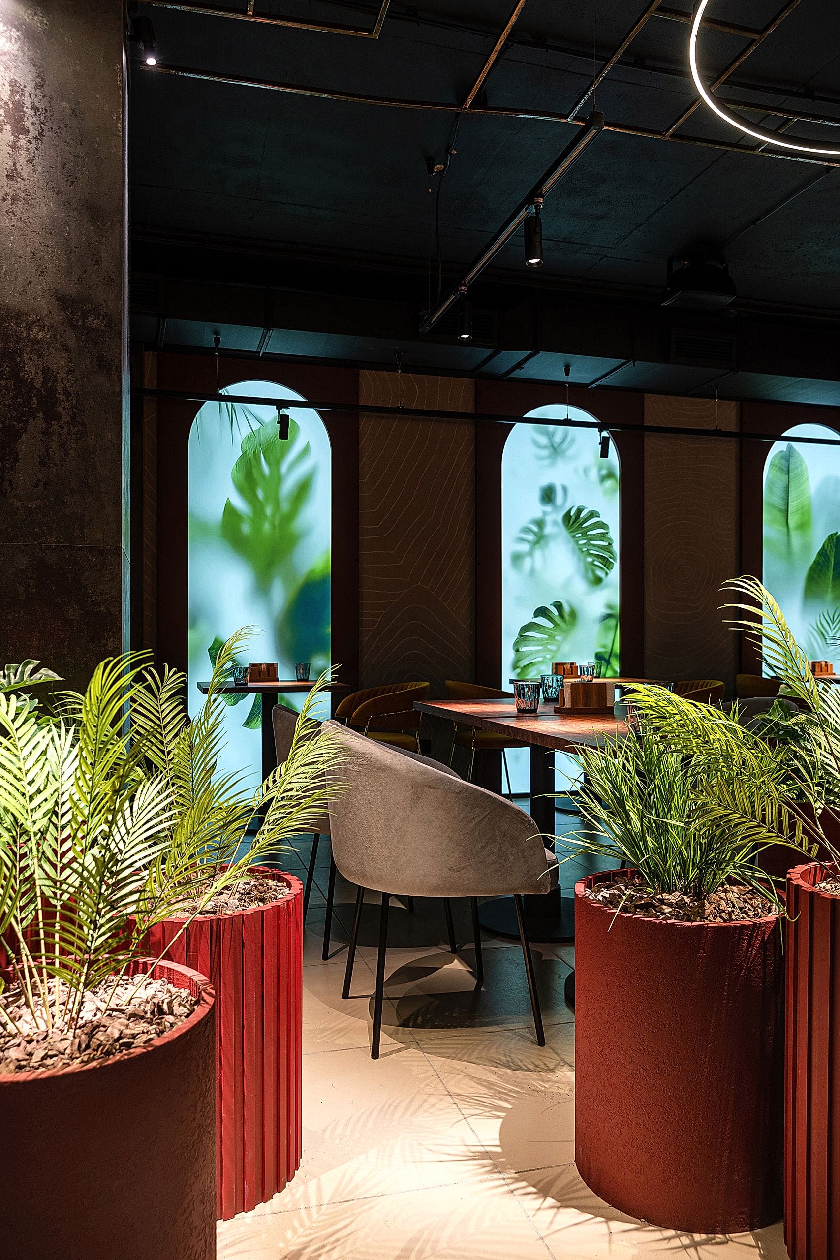 Совмещая актуальную палитру цветов, современные отделочные материалы, интересные нетривиальные решения по декору интерьера и авторскую графику, дизайнеры создали поистине оригинальное пространство, ничуть не уступающее заведениям, располагающимся в центре города. Заказчик - предприниматель с опытом, ответственно подошел к созданию данного проекта и воплотил его на сто процентов, что является, несомненно, большим успехом для дизайнера, поэтому мы создавали его с вдохновением и принимали участие в нем с самого начала и до завершения, разрабатывая вместе с заказчиком каждую оригинальную деталь ресторана, будь то бионические панно на стенах, фреска, передающая ощущение огня, или причудливо изогнутые светильники на потолке главного зала.