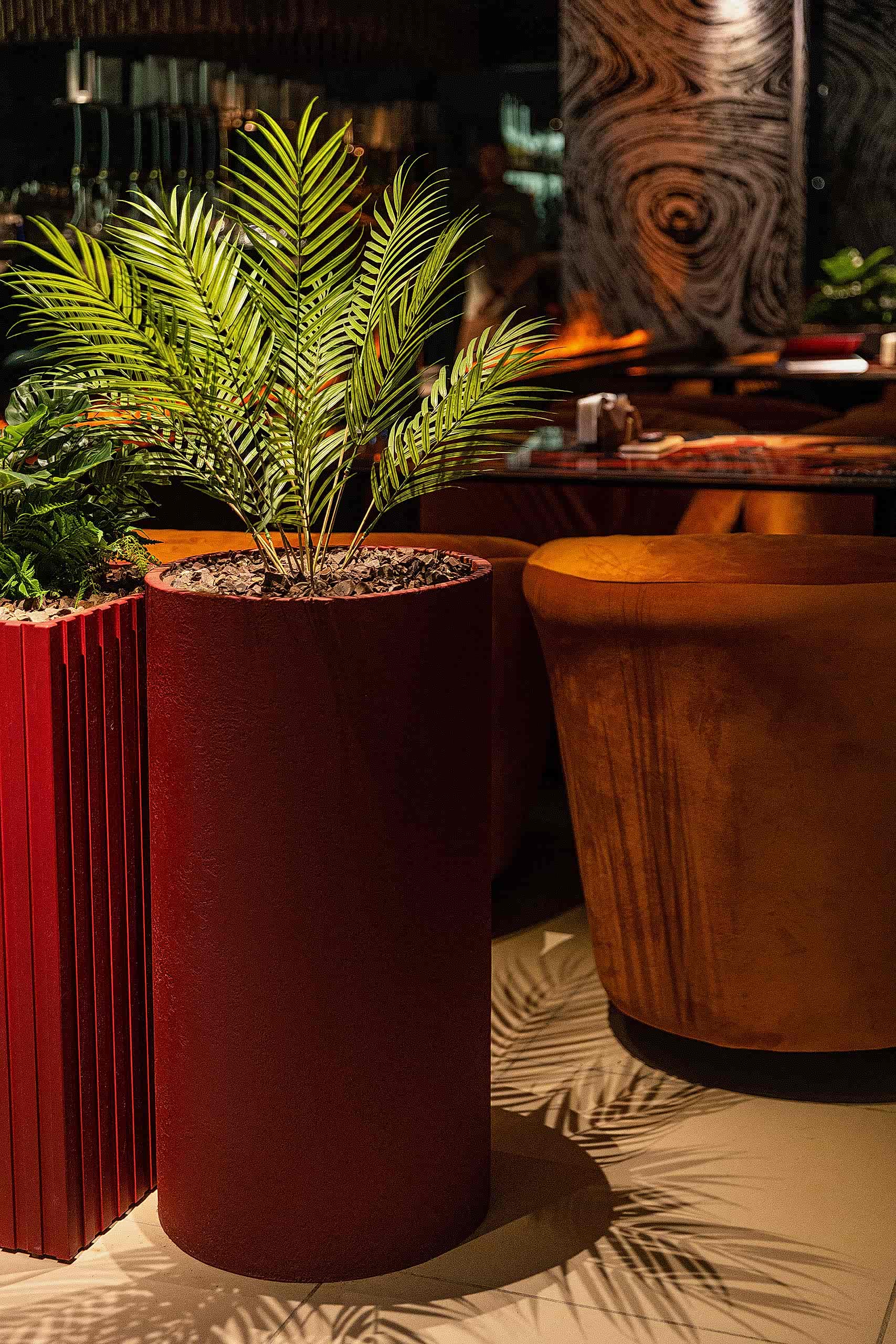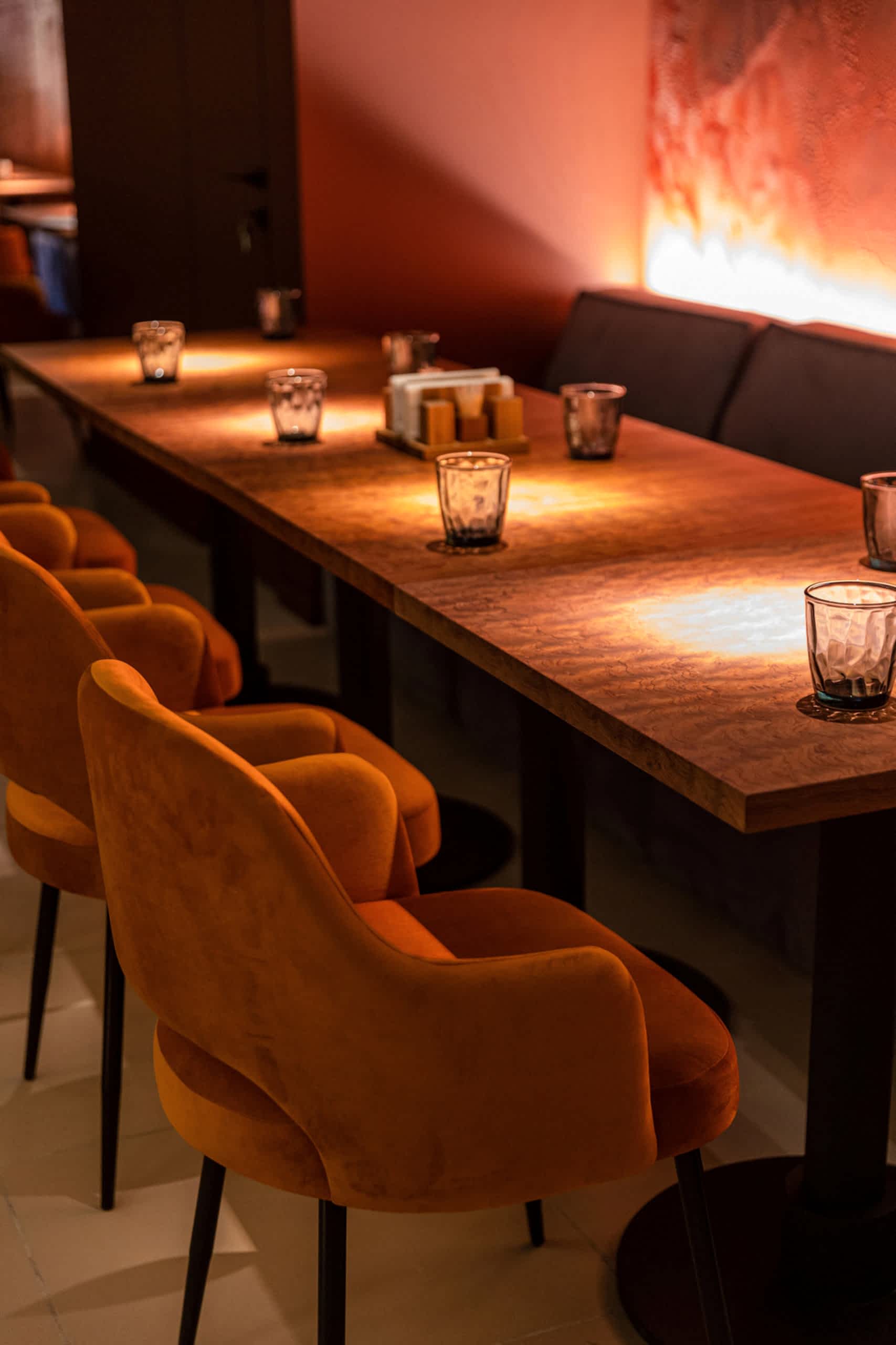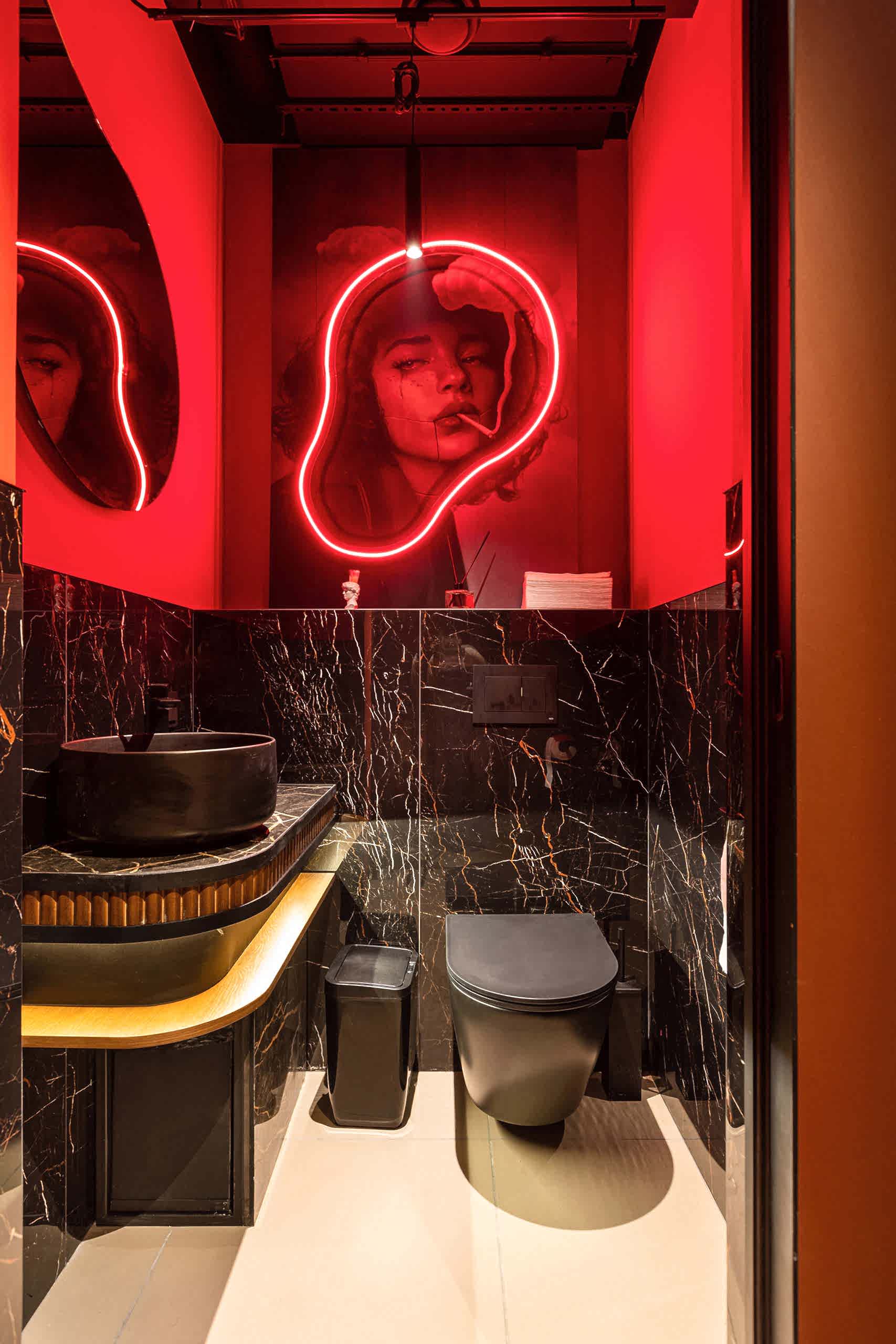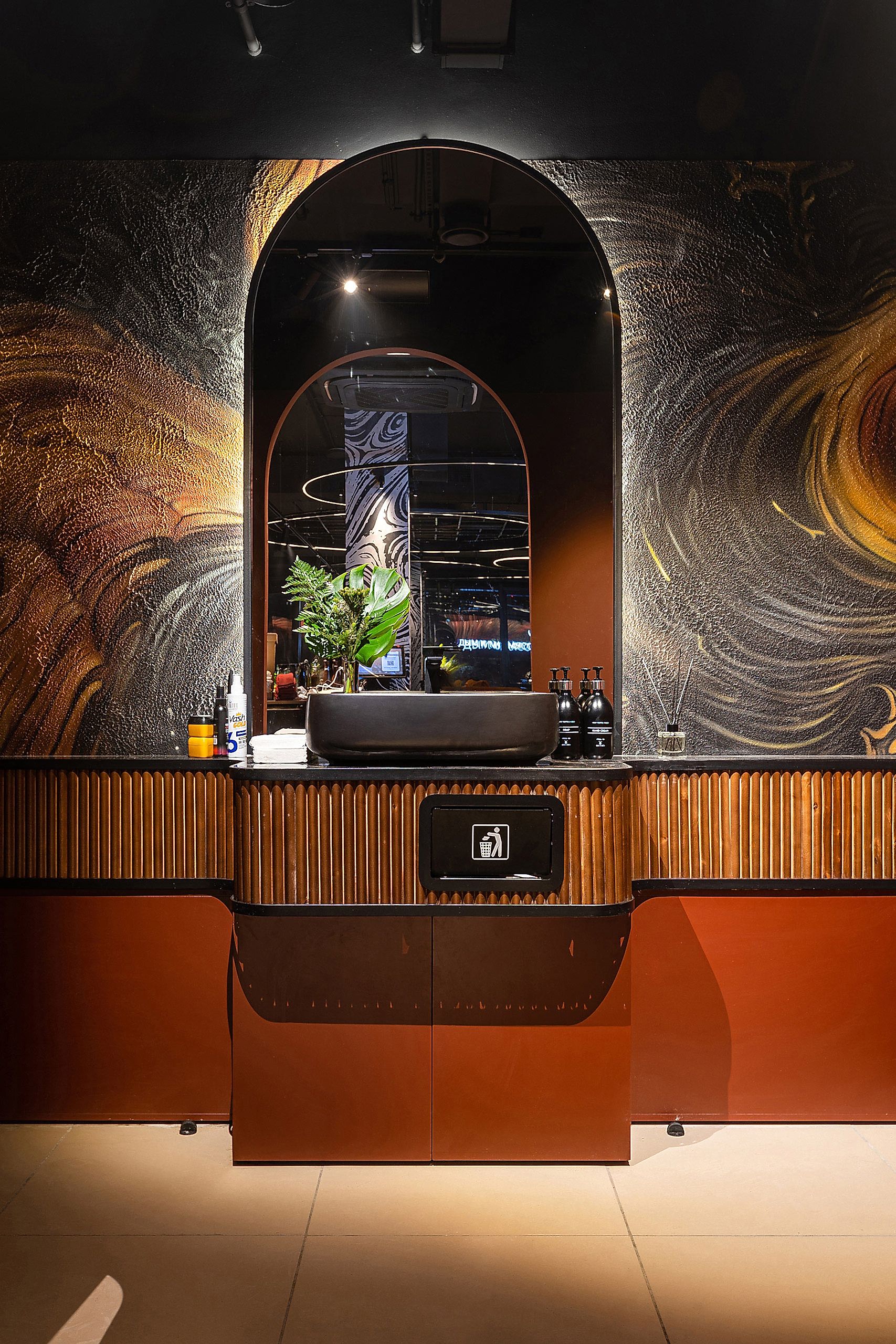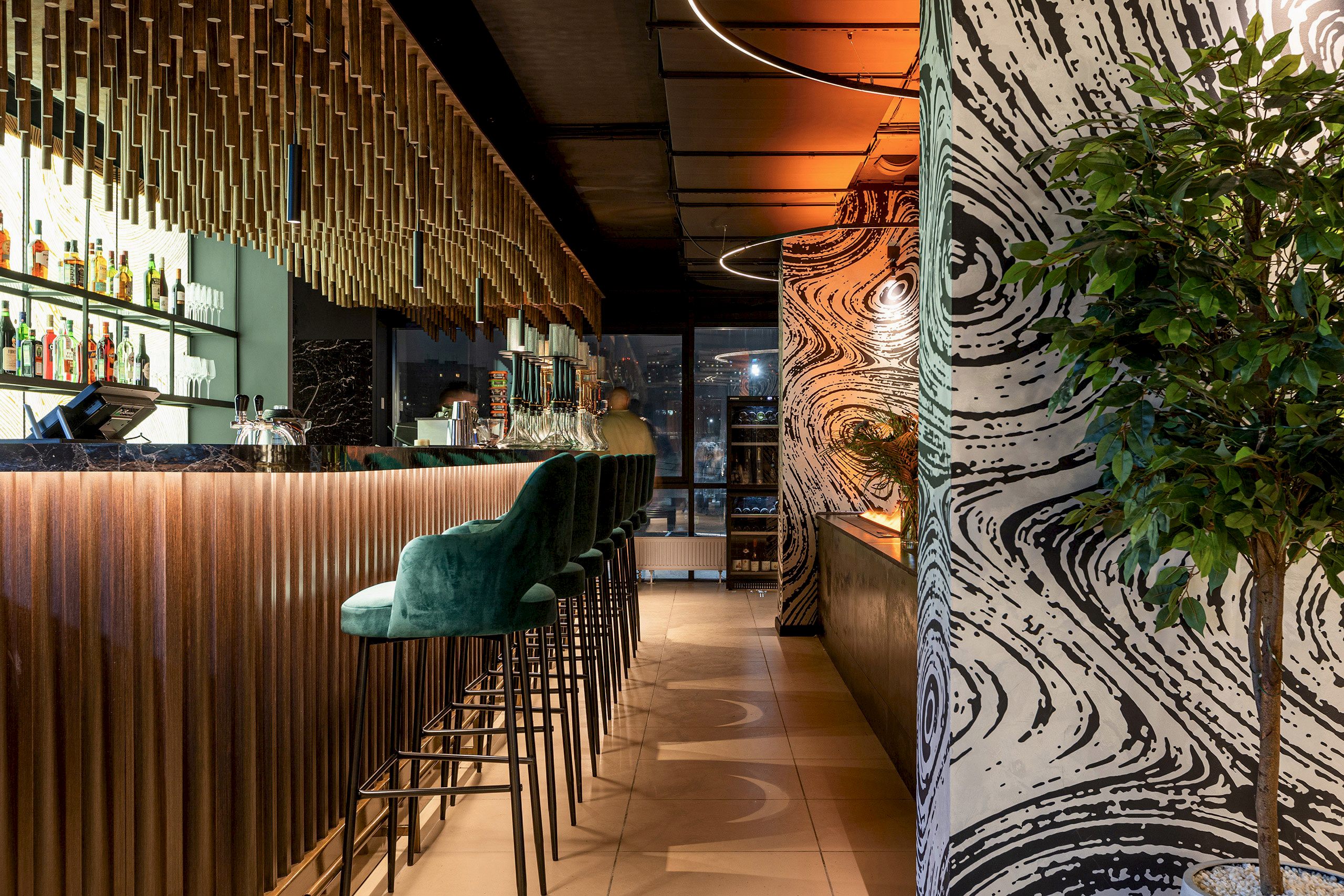 Совмещая актуальную палитру цветов, современные отделочные материалы, интересные нетривиальные решения по декору интерьера и авторскую графику, дизайнеры создали поистине оригинальное пространство, ничуть не уступающее заведениям, располагающимся в центре города. Заказчик - предприниматель с опытом, ответственно подошел к созданию данного проекта и воплотил его на сто процентов, что является, несомненно, большим успехом для дизайнера, поэтому мы создавали его с вдохновением и принимали участие в нем с самого начала и до завершения, разрабатывая вместе с заказчиком каждую оригинальную деталь ресторана, будь то бионические панно на стенах, фреска, передающая ощущение огня, или причудливо изогнутые светильники на потолке главного зала.
