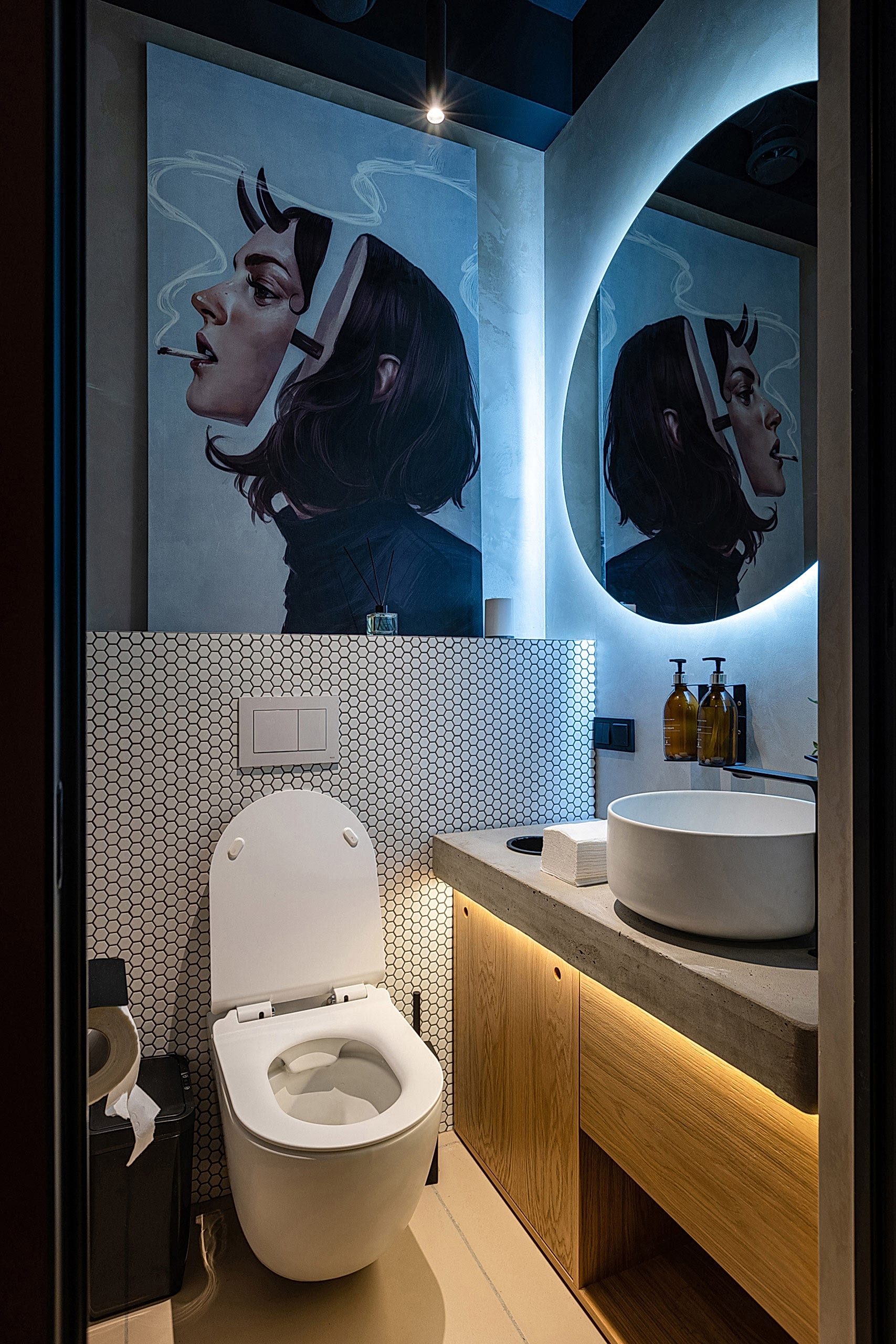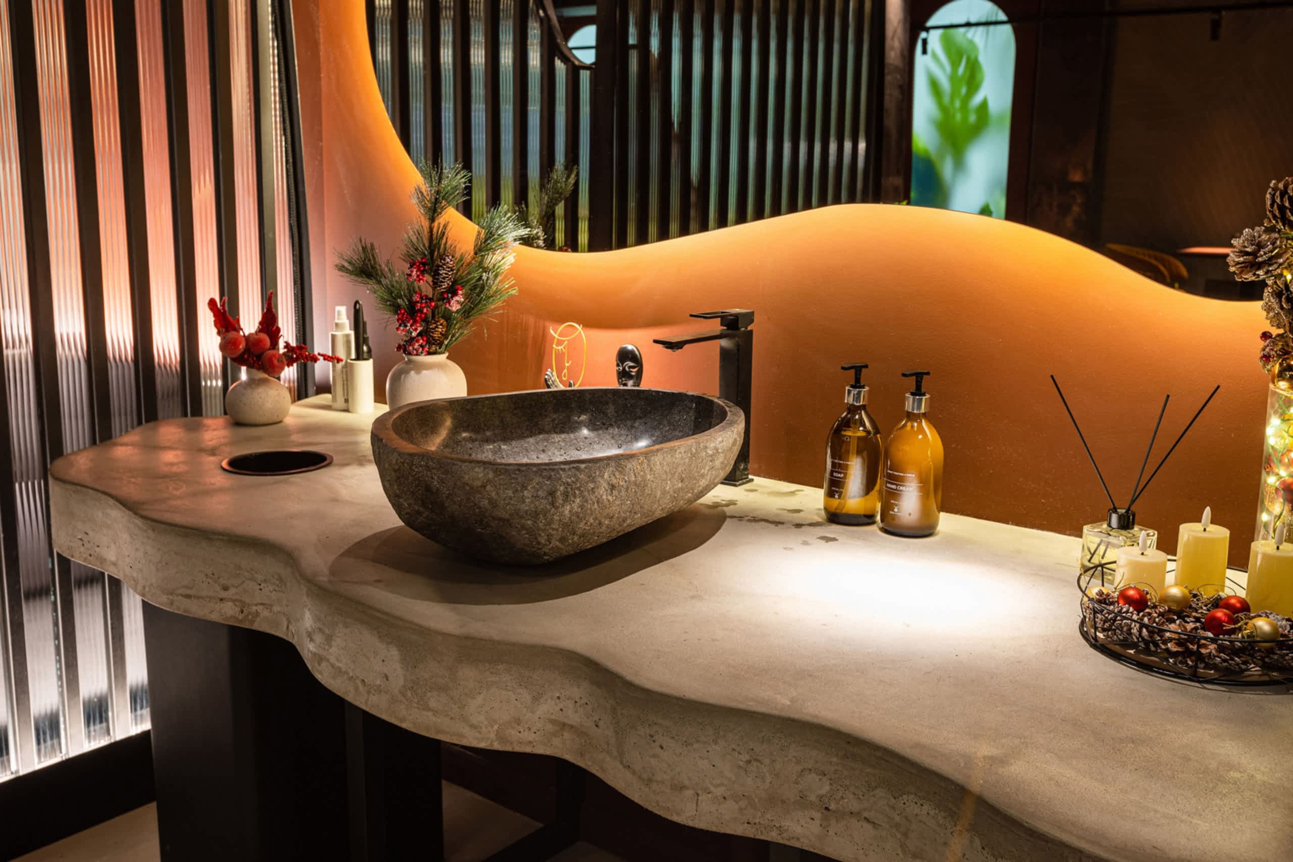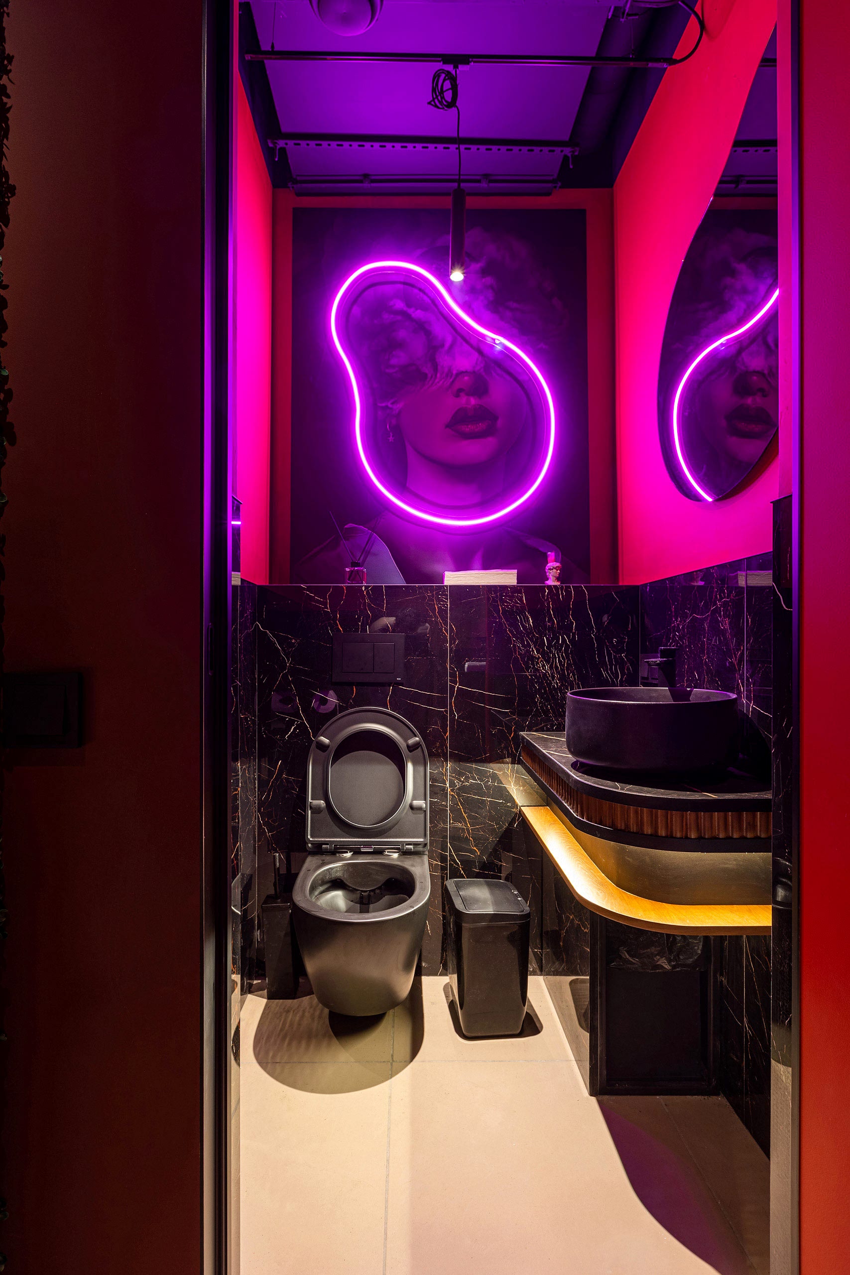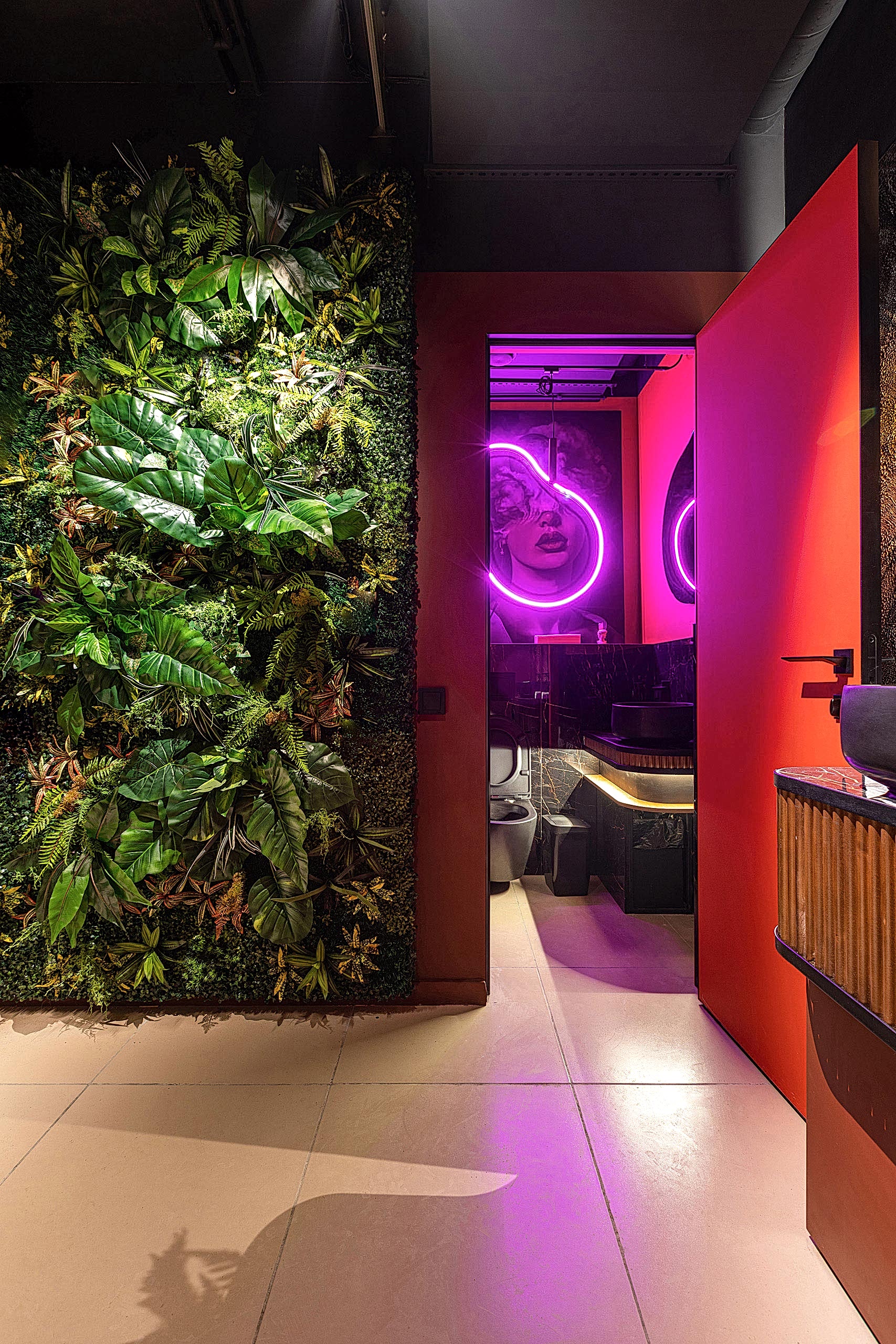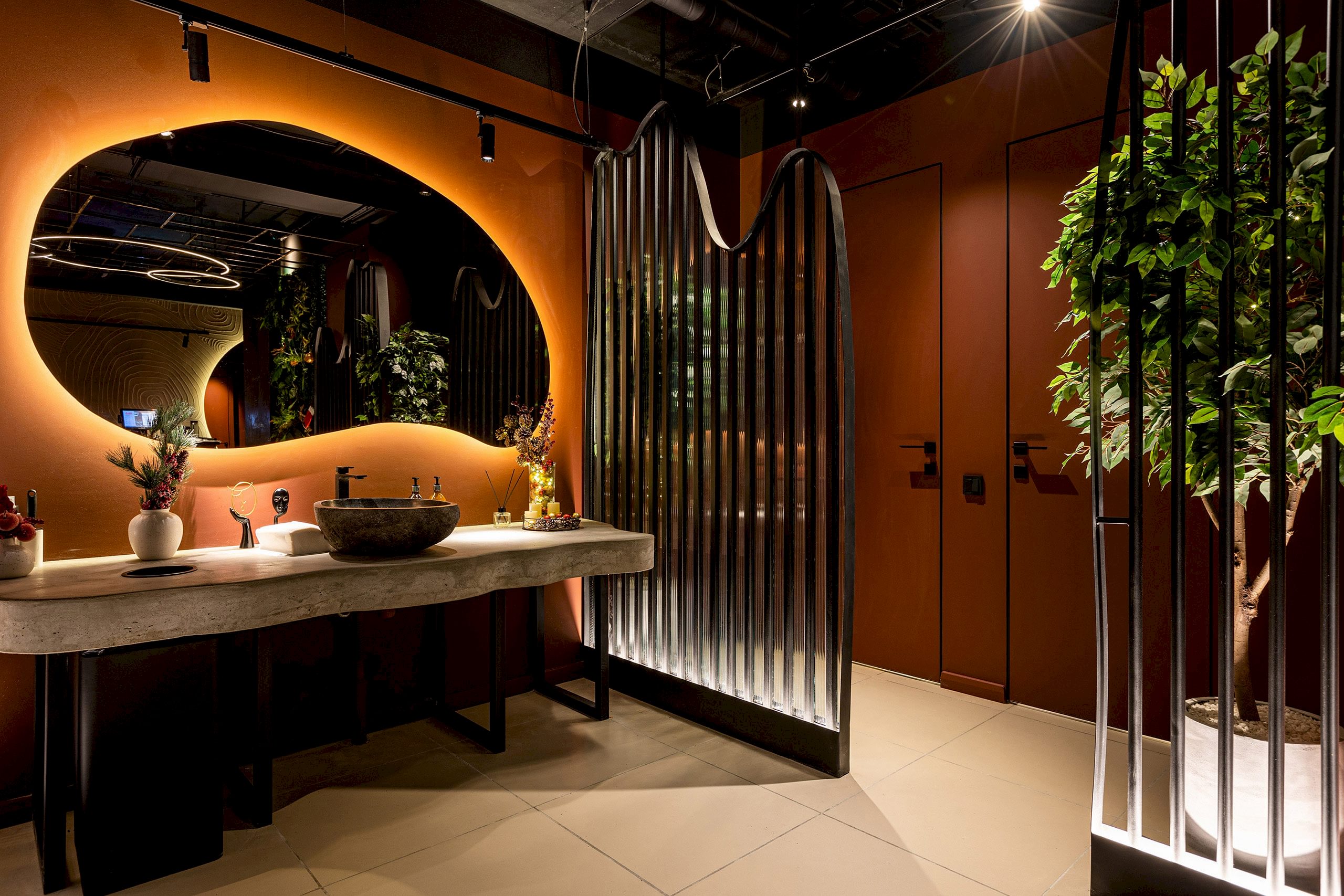 Совмещая актуальную палитру цветов, современные отделочные материалы, интересные нетривиальные решения по декору интерьера и авторскую графику, дизайнеры создали поистине оригинальное пространство, ничуть не уступающее заведениям, располагающимся в центре города. Заказчик - предприниматель с опытом, ответственно подошел к созданию данного проекта и воплотил его на сто процентов, что является, несомненно, большим успехом для дизайнера, поэтому мы создавали его с вдохновением и принимали участие в нем с самого начала и до завершения, разрабатывая вместе с заказчиком каждую оригинальную деталь ресторана, будь то бионические панно на стенах, фреска, передающая ощущение огня, или причудливо изогнутые светильники на потолке главного зала.