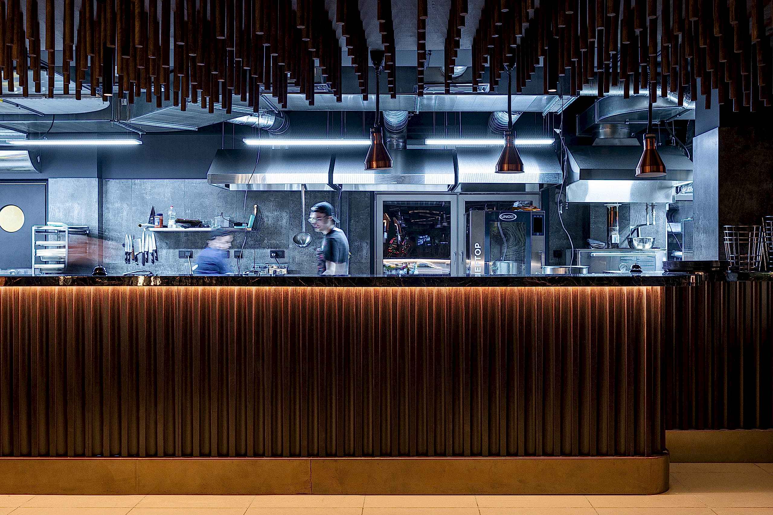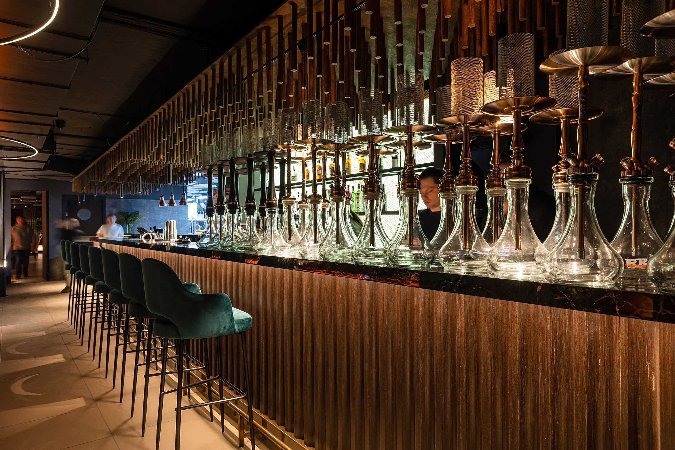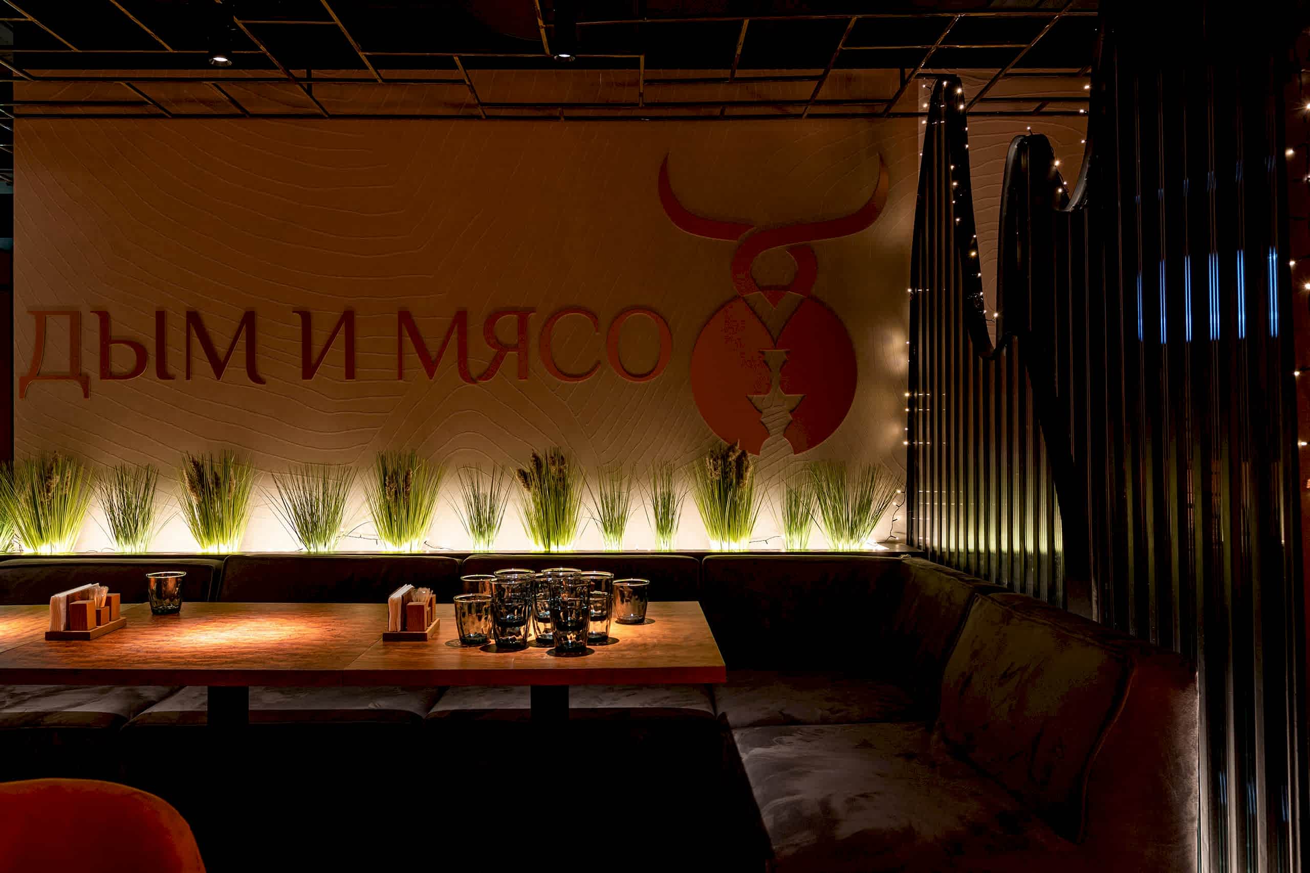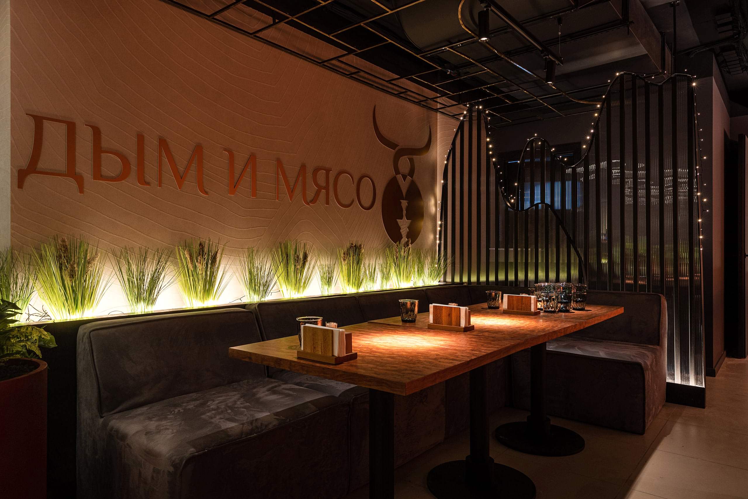 В данном интерьере мы преследовали несколько целей: совместить мясной ресторан и кальянную, при этом не перевешивая стиль интерьера ни в ту, ни в другую сторону, и это удалось. Место получилось актуальным, модным, стильным и одновременно уютным.
