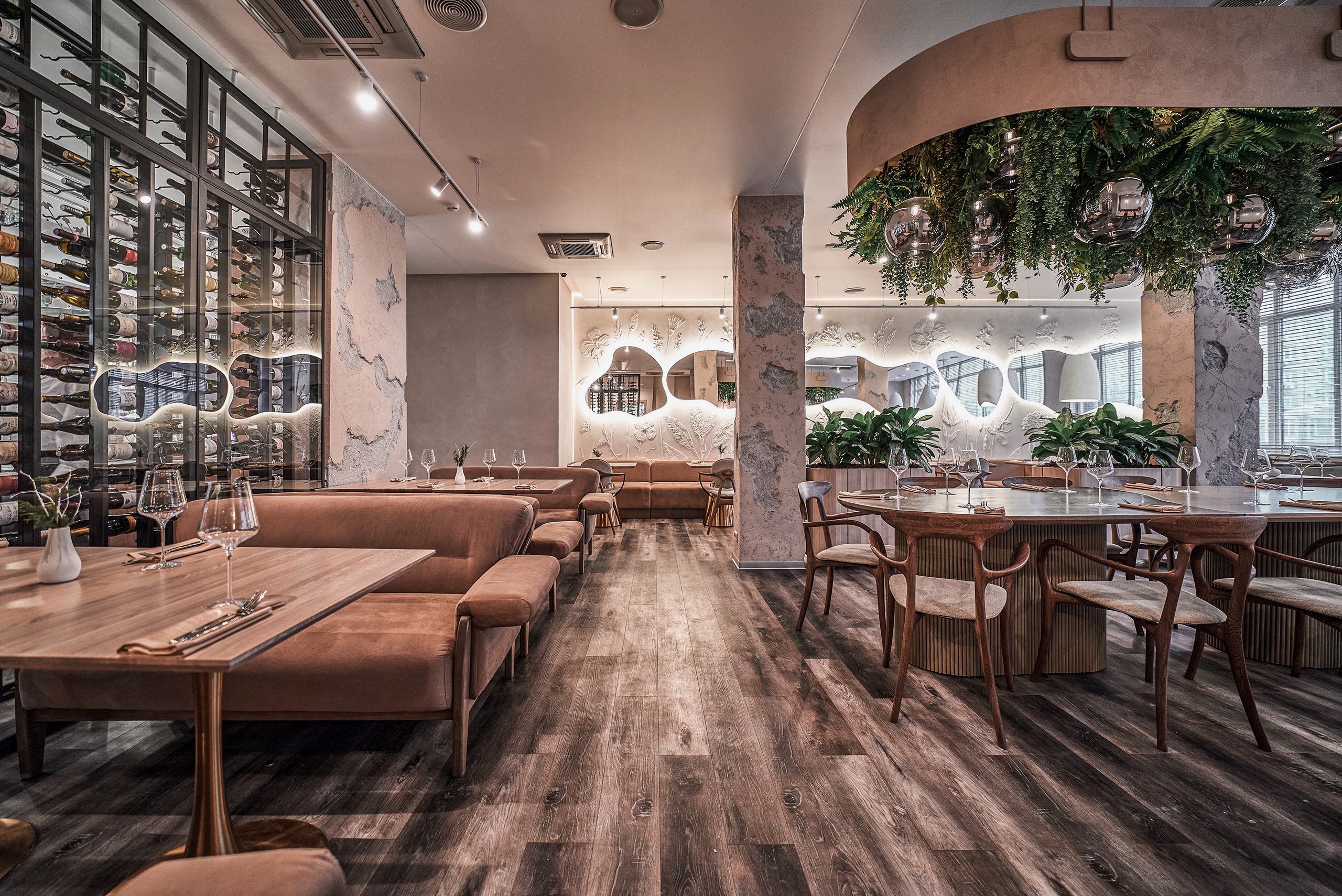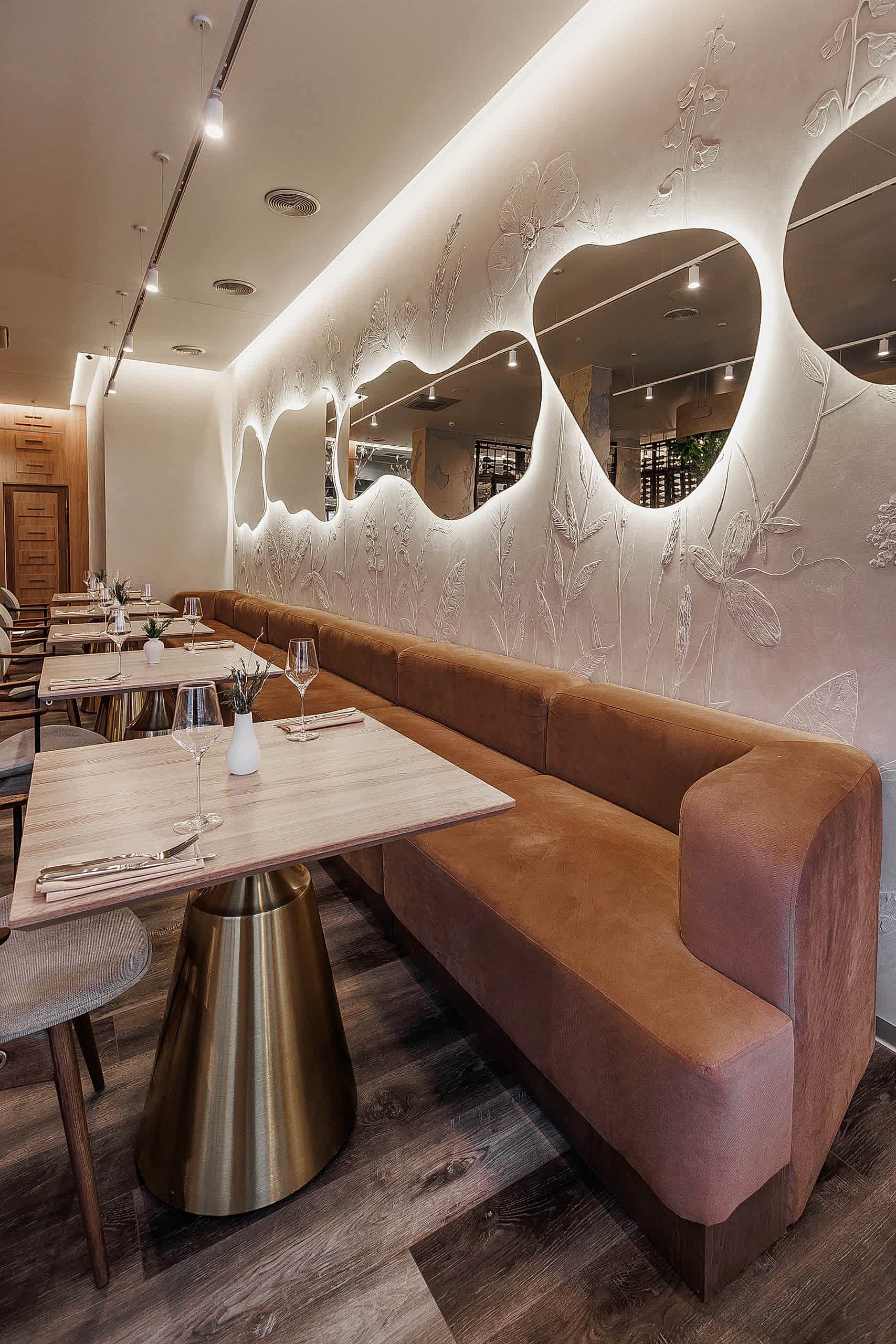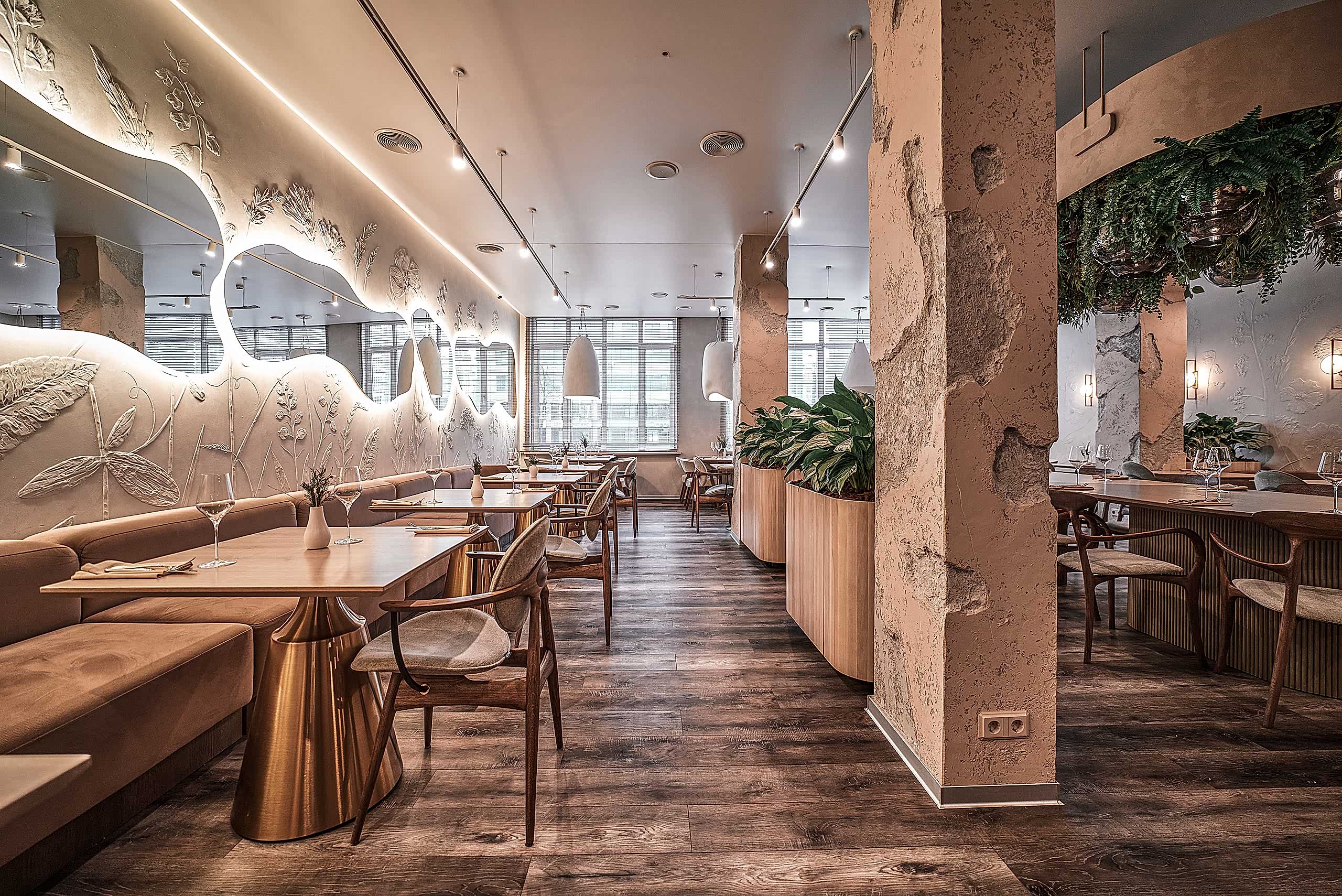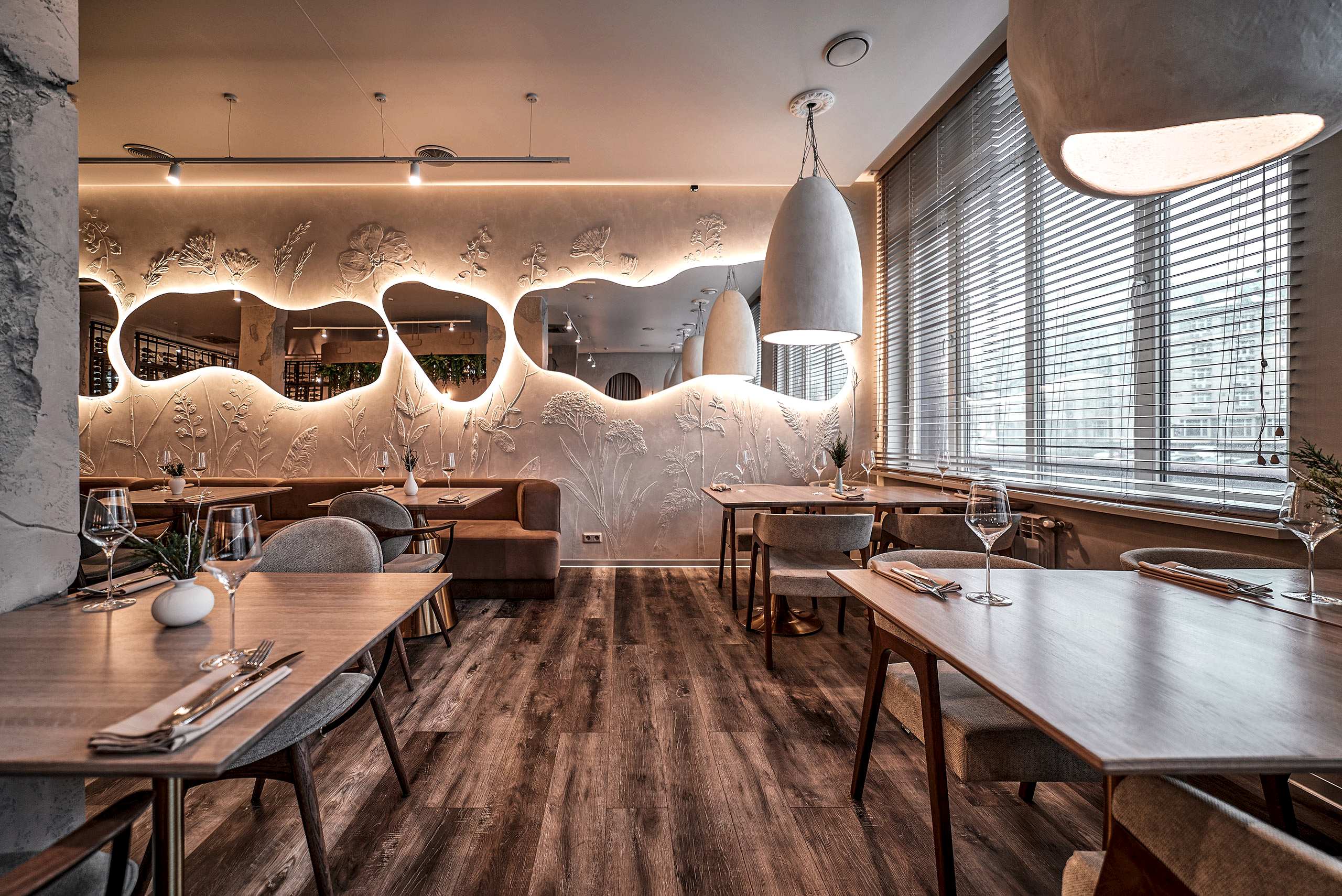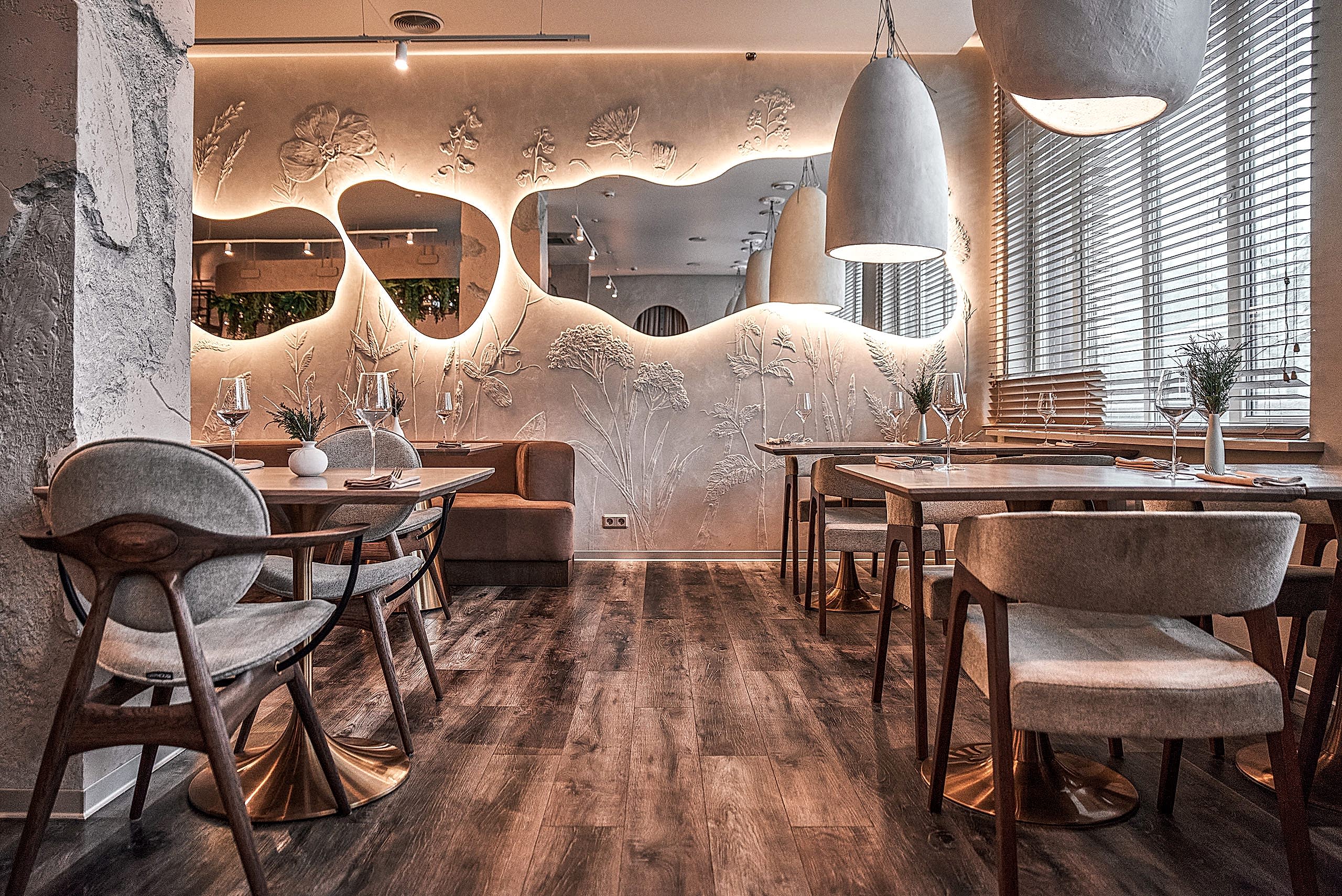 Интерьер ресторана «Трюфель» в Нижнем Новгороде выполнен в спокойной, умиротворяющей манере, которая создает атмосферу гармонии и уюта. Природная тематика является основным мотивом оформления. Стены украшены изящными барельефами в виде цветов и растительности, что придает пространству легкость и воздушность. Натуральные материалы играют важную роль в дизайне: в декоре использованы оттенки песка, дерева и камня.