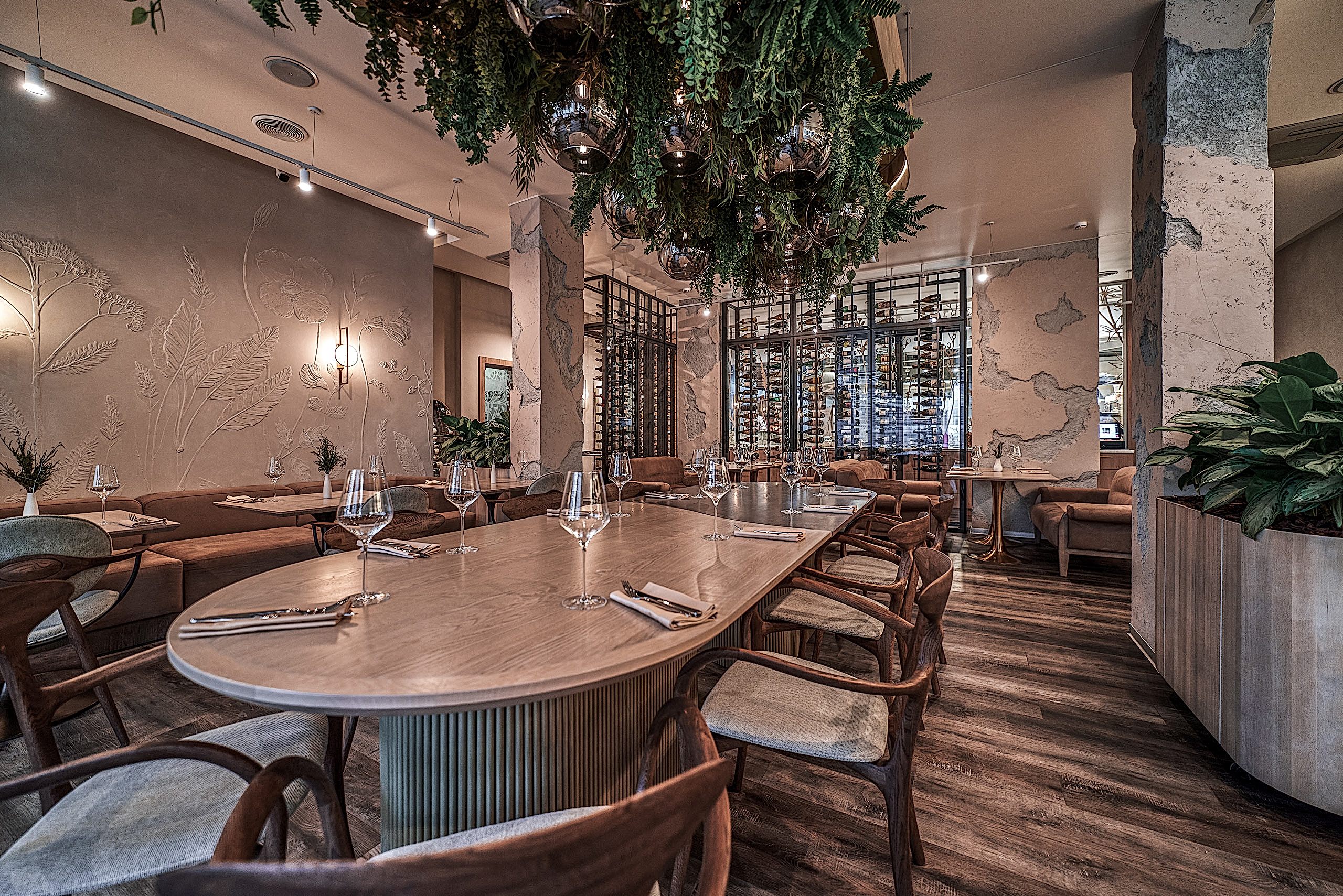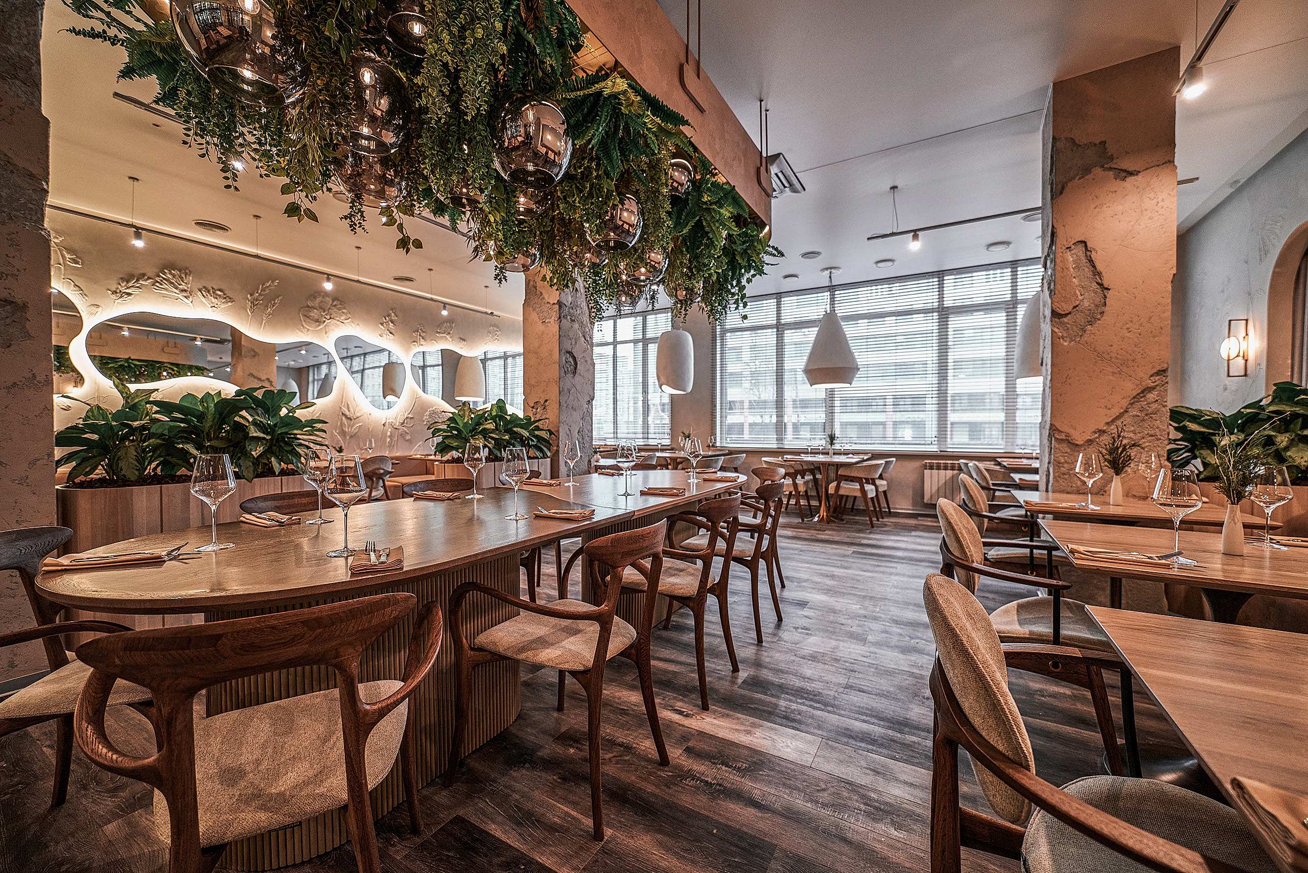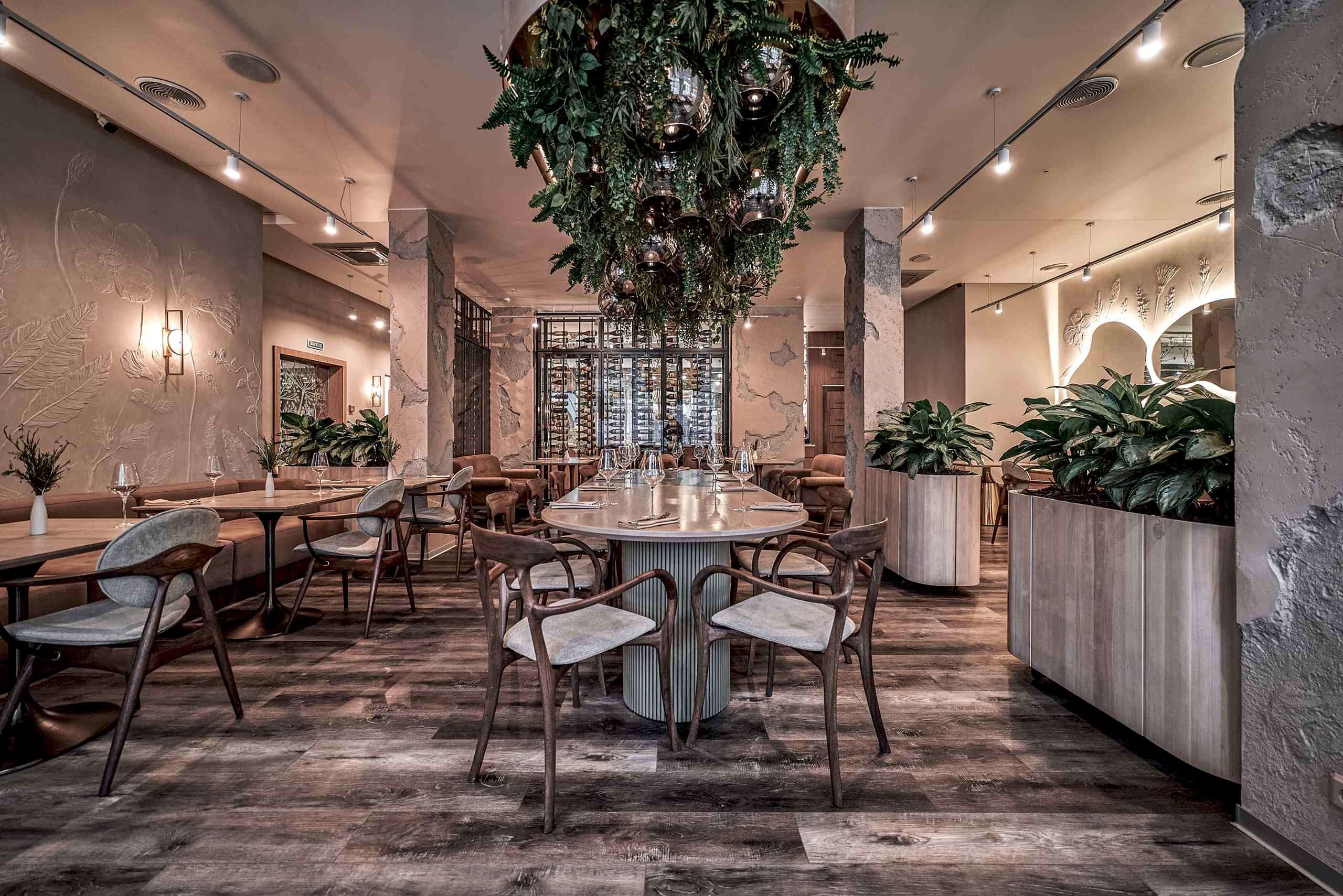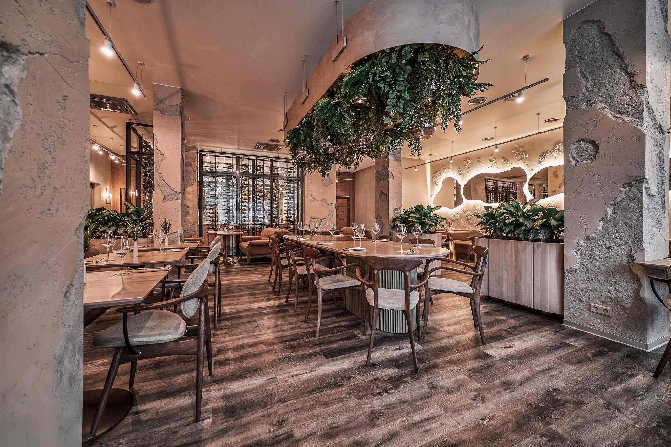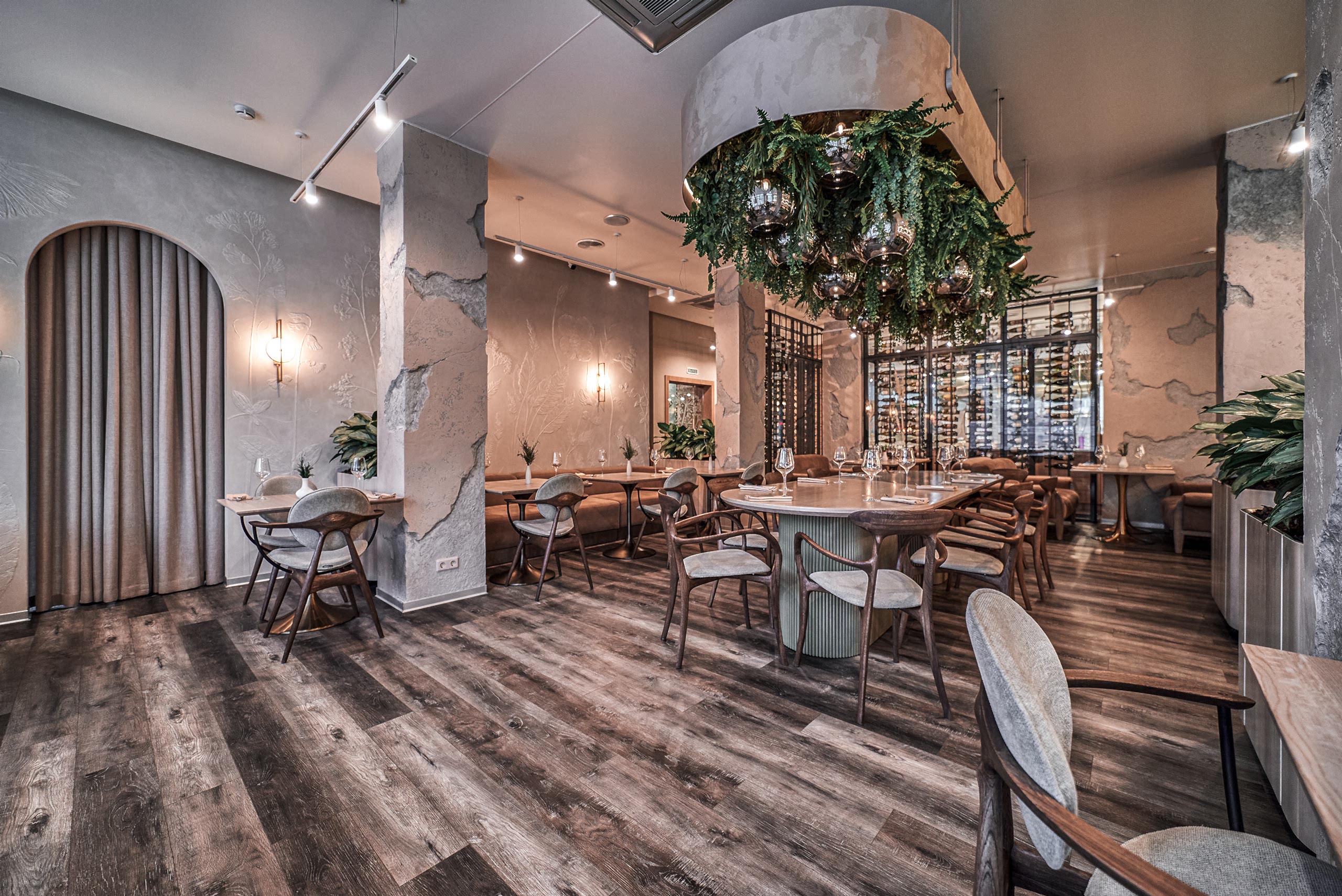 Интерьер ресторана «Трюфель» в Нижнем Новгороде выполнен в спокойной, умиротворяющей манере, которая создает атмосферу гармонии и уюта. Природная тематика является основным мотивом оформления. Стены украшены изящными барельефами в виде цветов и растительности, что придает пространству легкость и воздушность. Натуральные материалы играют важную роль в дизайне: в декоре использованы оттенки песка, дерева и камня.