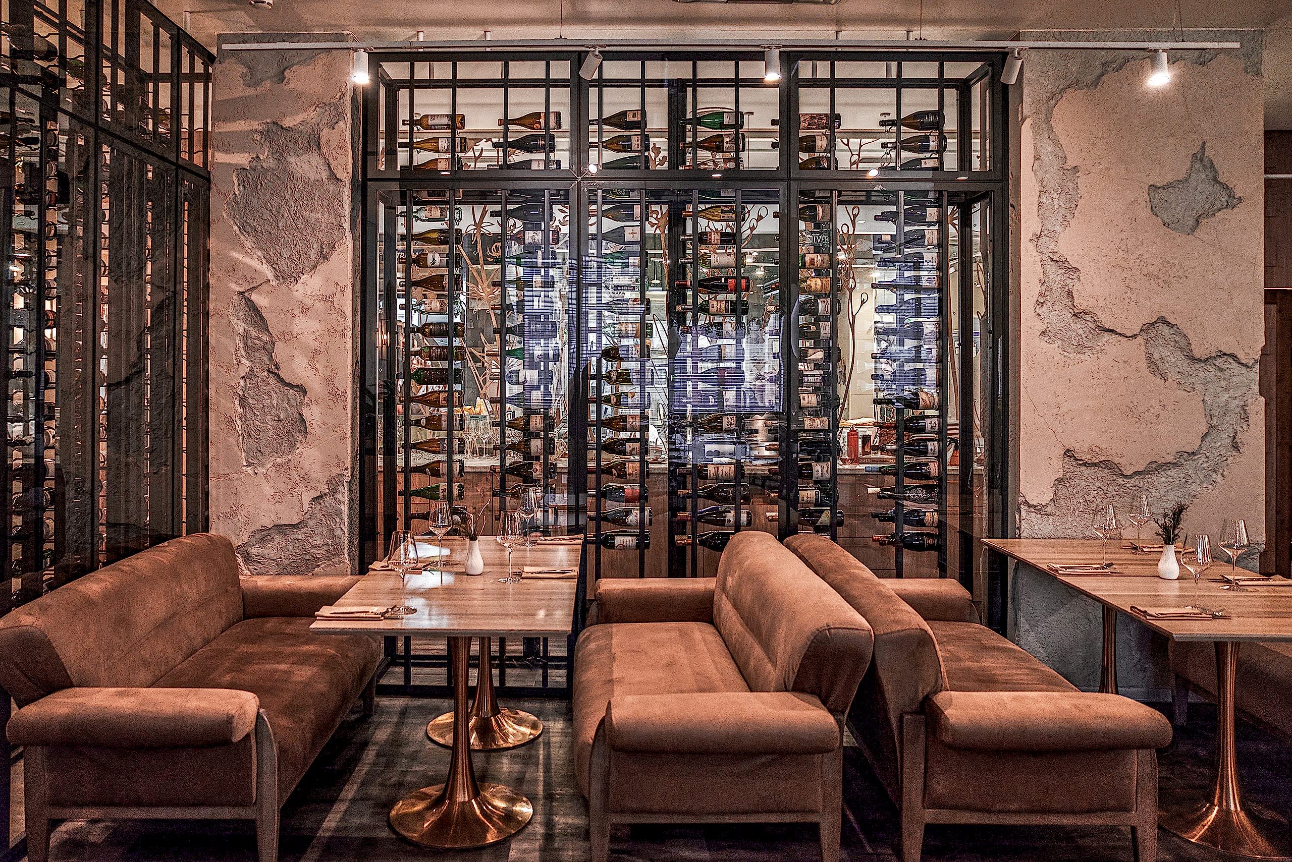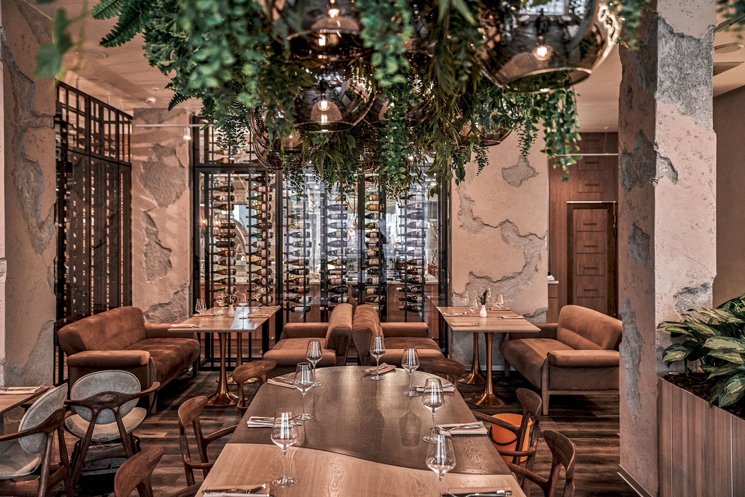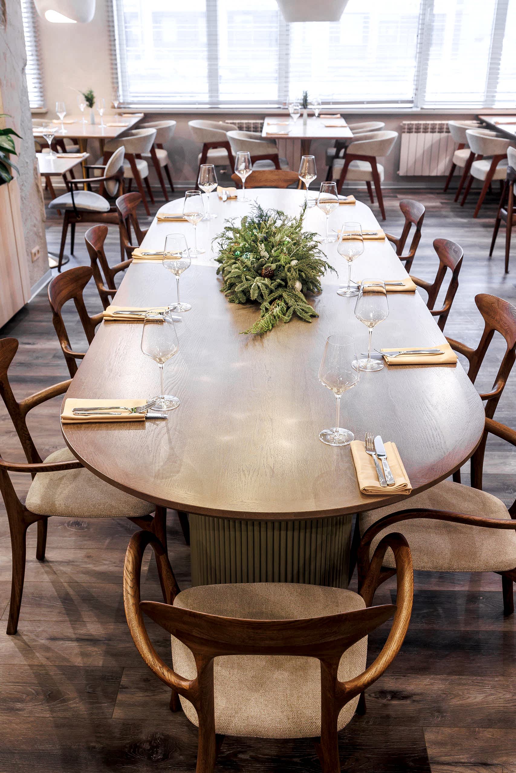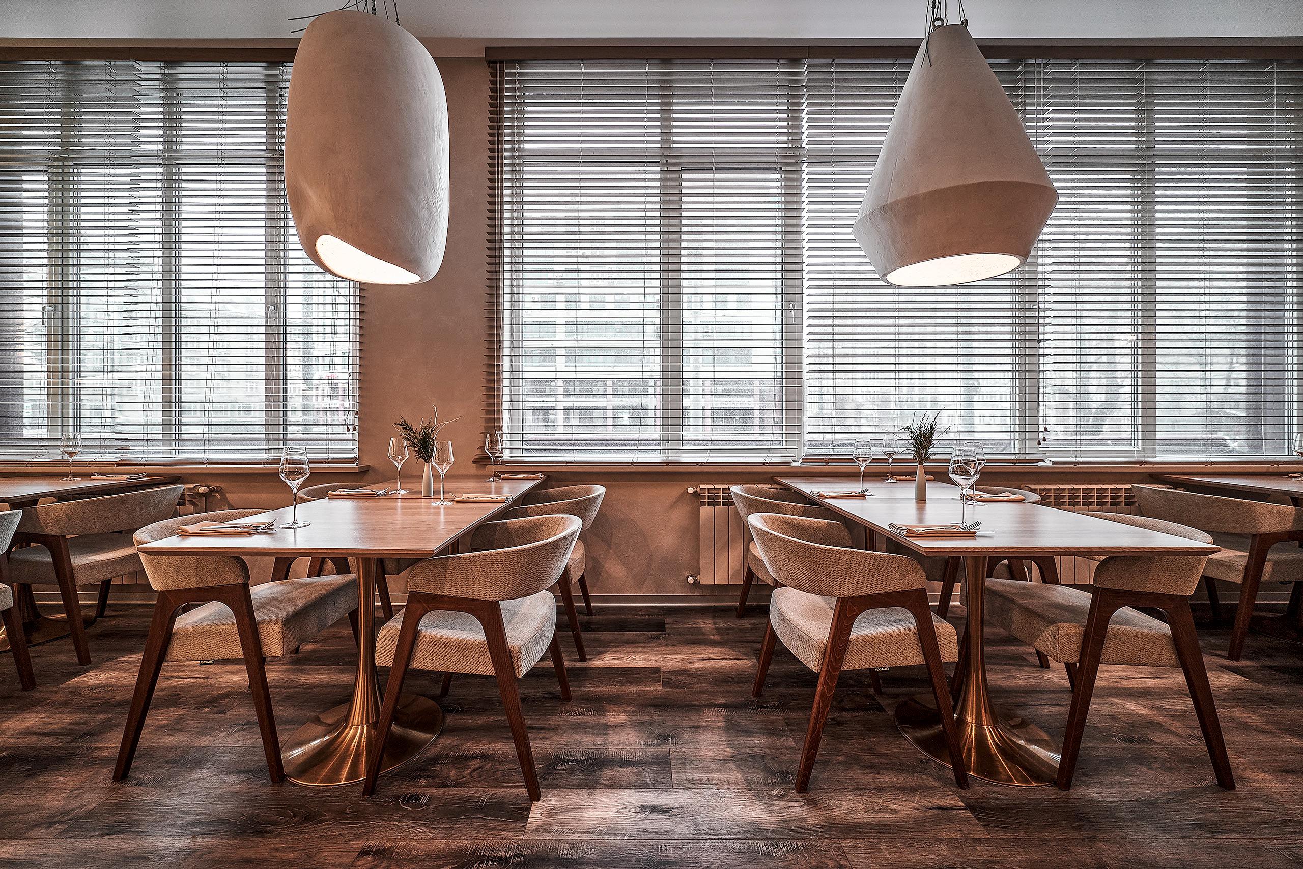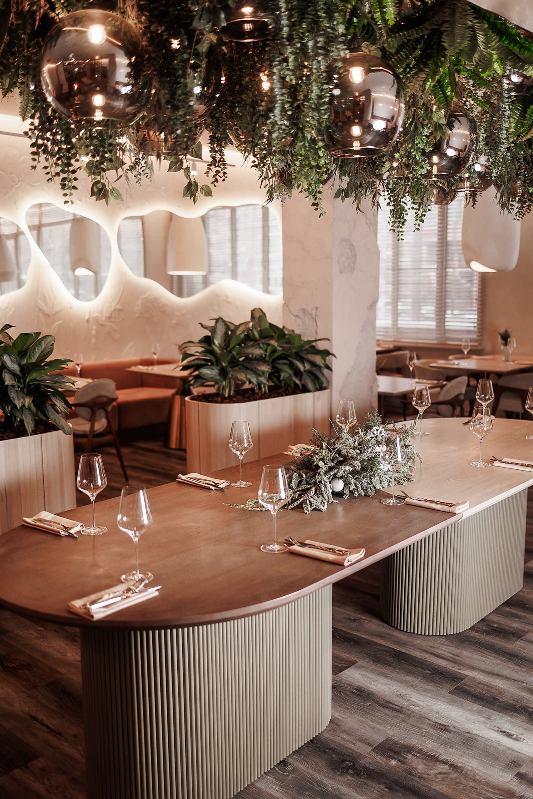 Интерьер ресторана «Трюфель» в Нижнем Новгороде выполнен в спокойной, умиротворяющей манере, которая создает атмосферу гармонии и уюта. Природная тематика является основным мотивом оформления. Стены украшены изящными барельефами в виде цветов и растительности, что придает пространству легкость и воздушность. Натуральные материалы играют важную роль в дизайне: в декоре использованы оттенки песка, дерева и камня.