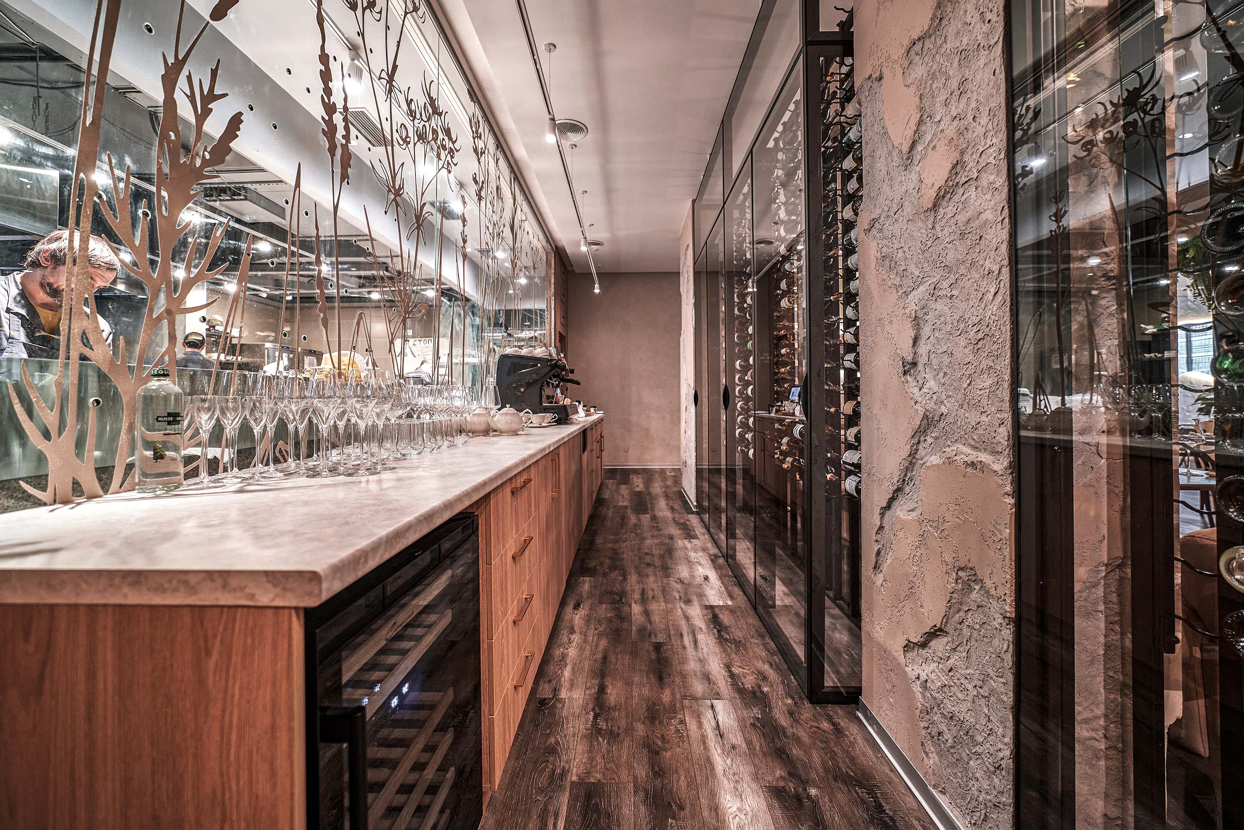 Открытая кухня является важной частью интерьера – из зала ресторана можно наблюдать за процессом приготовления блюд и увидеть, как пылает огонь в дровяной печи. Это добавляет особый шарм и аутентичность пространству. Функциональное зонирование включает отдельную детскую комнату, что позволяет родителям наслаждаться отдыхом, пока дети заняты играми.