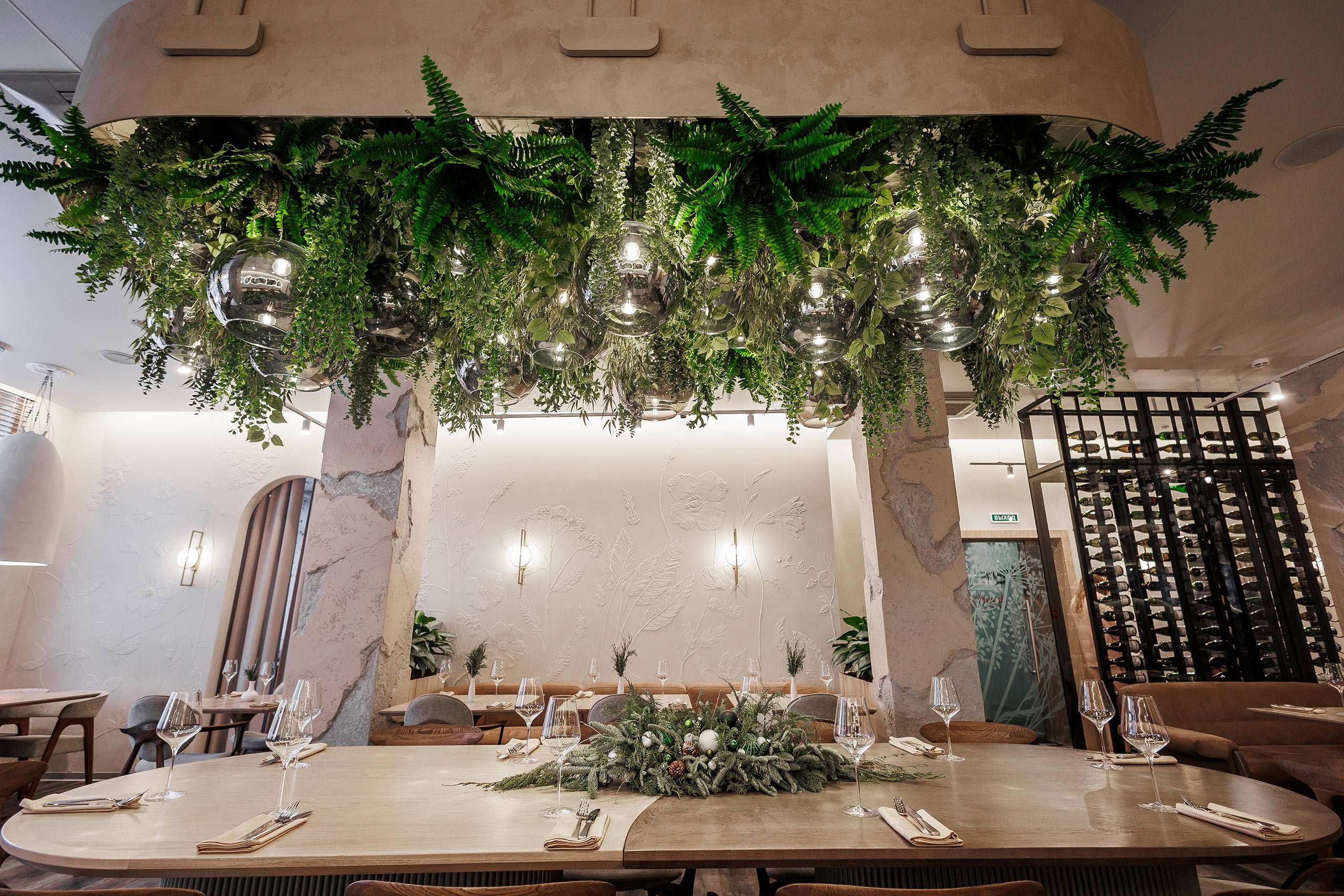 Особое внимание привлекает центральный элемент – пышный островок зелени над главным столом. Зеркальные элементы в форме озер создают эффект расширения пространства и добавляют интерьеру элегантности.